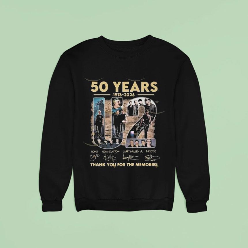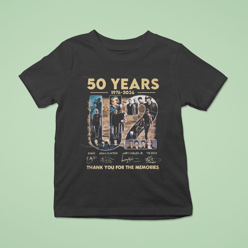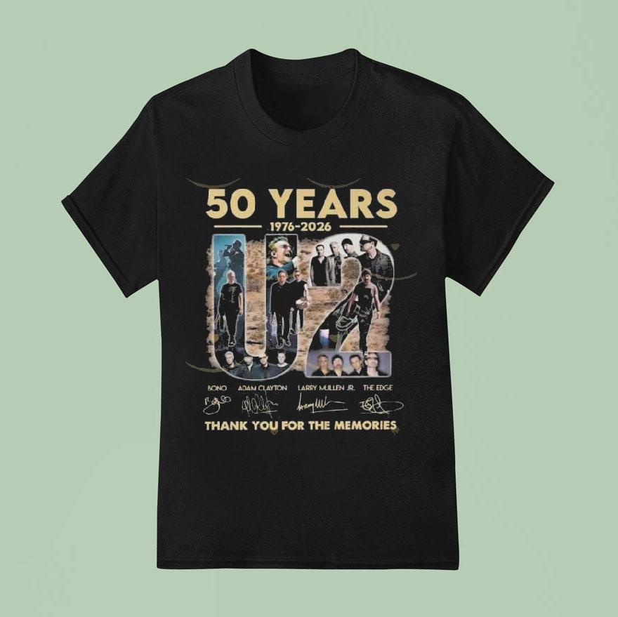 Your style, your tee with 50 Years 1976-2026 U2 Signature Thank You For The Memories Signatures Shirt, “Celebrate 50 years of iconic music with U2’s signature thank you for the memories t-shirt. From 1976 to 2026, this shirt encapsulates the band’s journey and their impact on fans worldwide. Show your love for U2 with this timeless and nostalgic piece. “