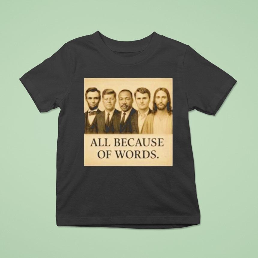 Your go-to casual choice with Abraham Lincoln John F. Kennedy Jesus And Charlie Kirk All Because Of Words Was Assassinated Shirt, abraham Lincoln, John F. Kennedy, Jesus, and Charlie Kirk: four influential figures from different times and backgrounds, all brought together by one common thread – words. These words left a lasting impact, ultimately leading to tragic consequences on a shirt that reads “Assassinated.”