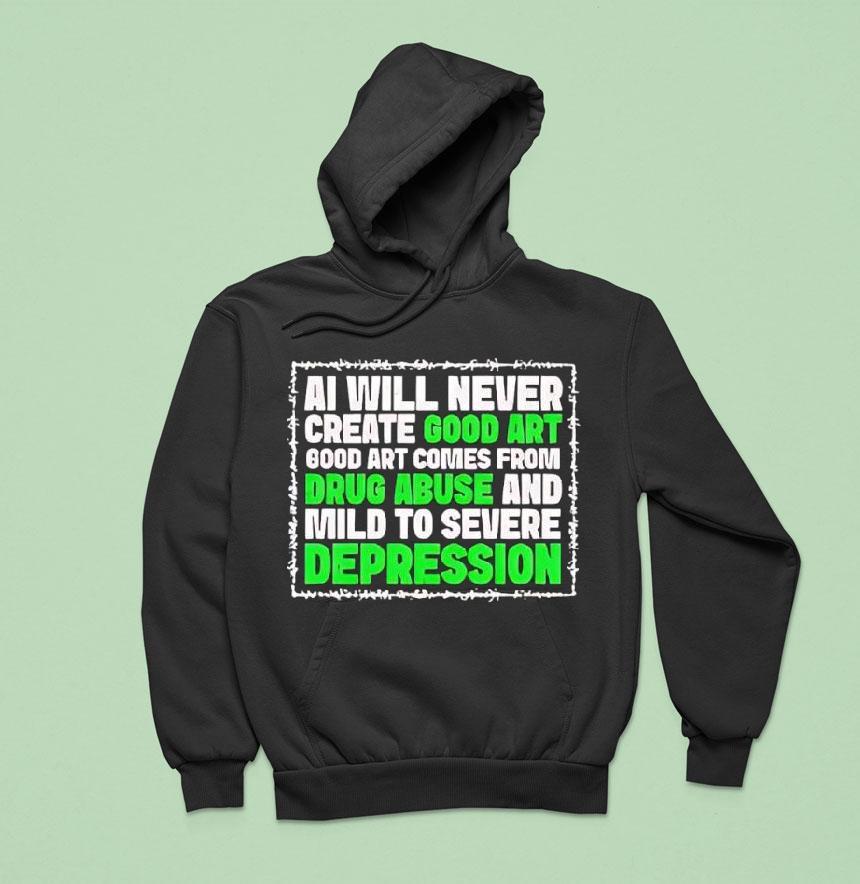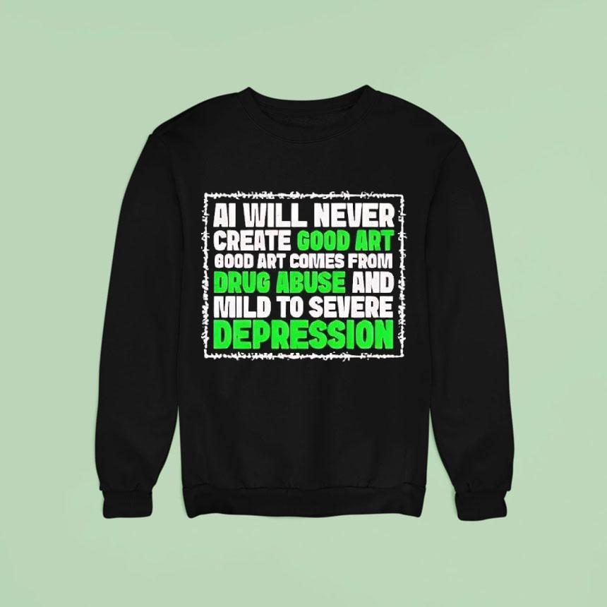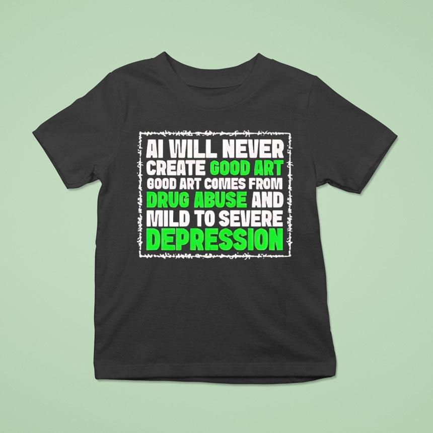 Wardrobe staple, endless style with Ai Green Will Never Create Good Art Good Art Comes From Drug Abuse And Mild To Severe Depression Shirt, “Can artificial intelligence ever truly create good art? While Ai Green may be capable of producing visually pleasing pieces, the true depth and emotion that comes with good art can only be achieved through human experiences, such as drug abuse and depression.”