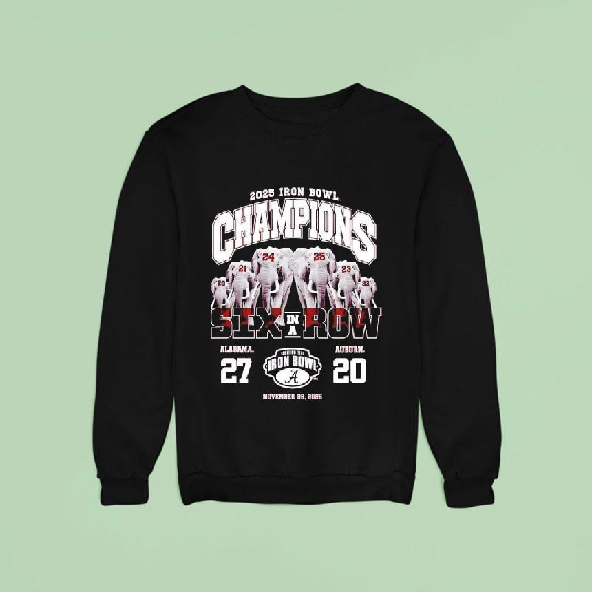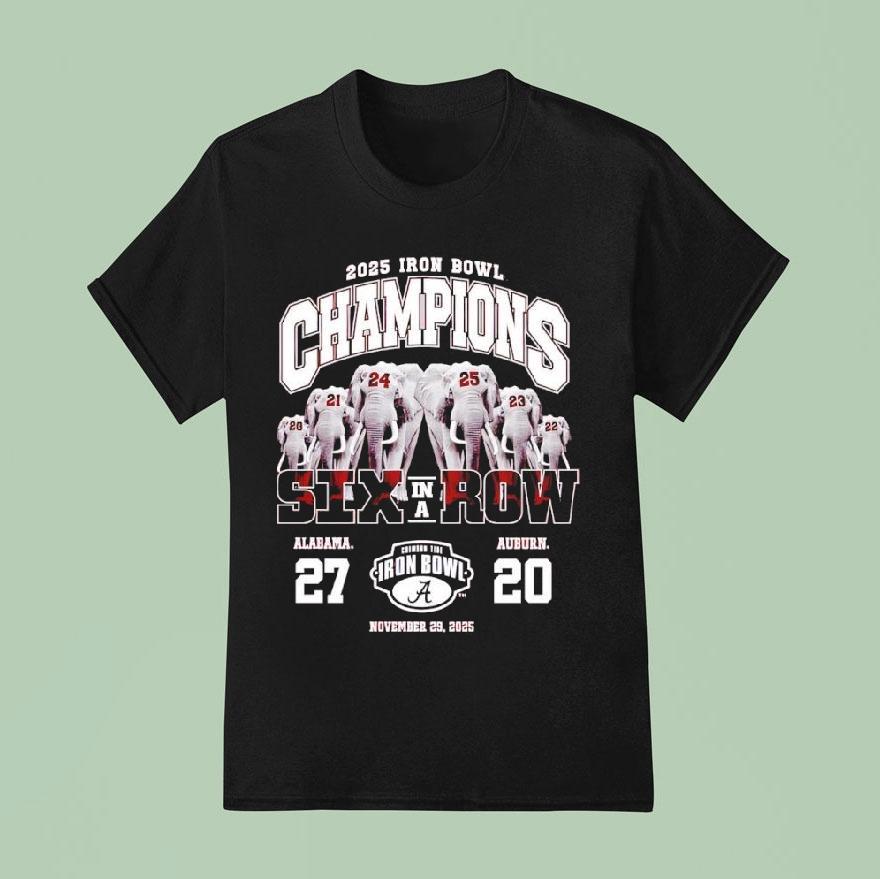Essential wardrobe staple with Alabama Crimson Tide 2025 Iron Bowl Champions Six In A Row Win Shirt, celebrate the Alabama Crimson Tide’s dominant run in the Iron Bowl with their commemorative 2025 Champions Six In A Row Win shirt. Show your support for the Tide’s historic sixth consecutive victory over their rival with this must-have piece for any fan. Roll Tide!
