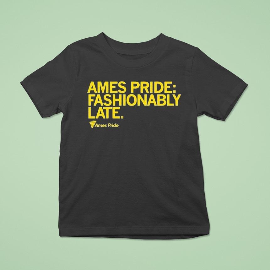 Uncomplicated elegance with Ames Pride Fashionably Late Shirt, ames Pride unveils their latest collection with the Fashionably Late Shirt. This bold and stylish shirt is the perfect statement piece for those who live life on their own terms. Show your Ames pride and fashionably make your entrance with this must-have shirt.