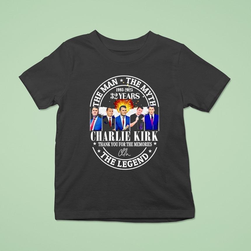 Versatile style, always chic with Charlie Kirk The Man The Myth The Legend 32 Years 1993 2025 Thank You For The Memories Shirt, charlie Kirk: The name that has become synonymous with conservative politics and inspiring young minds. From his beginnings in 1993 to his present-day impact, he has truly captured the hearts of many. As he turns 32 in 2025, let us reflect and thank him for the memories with this iconic shirt.