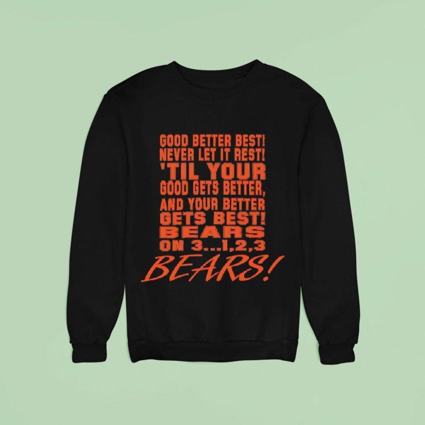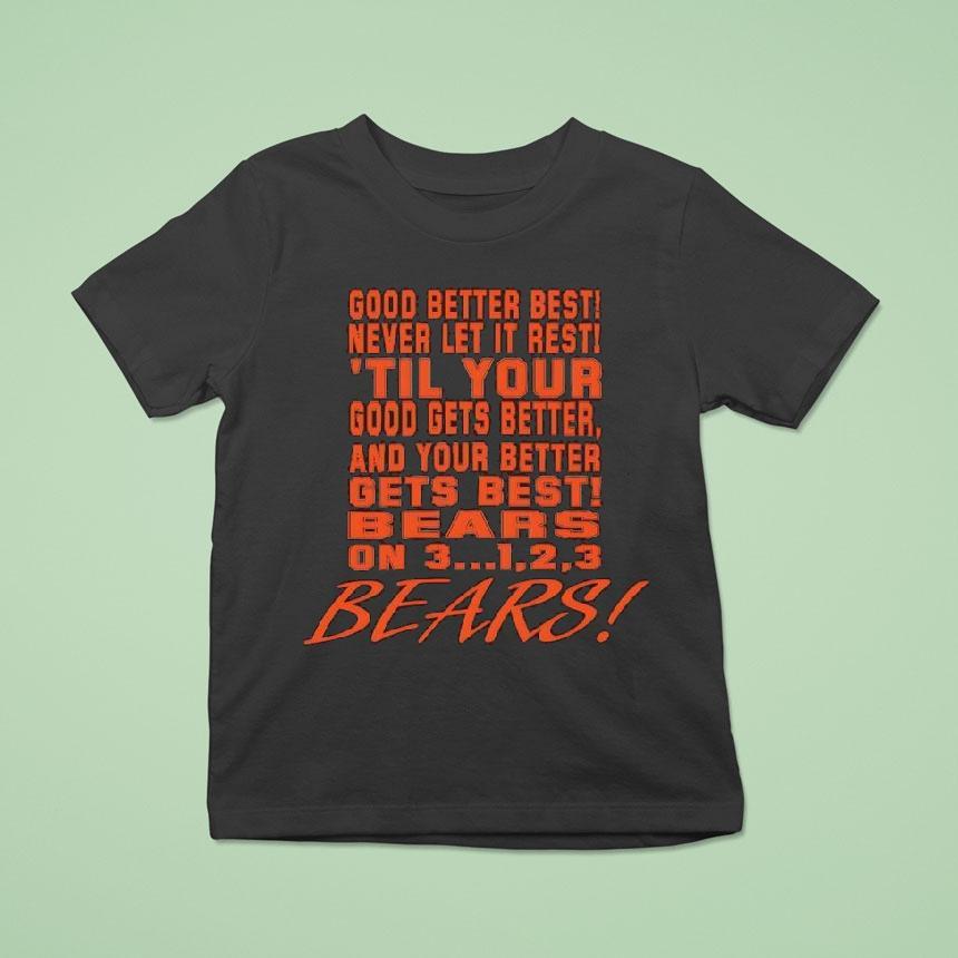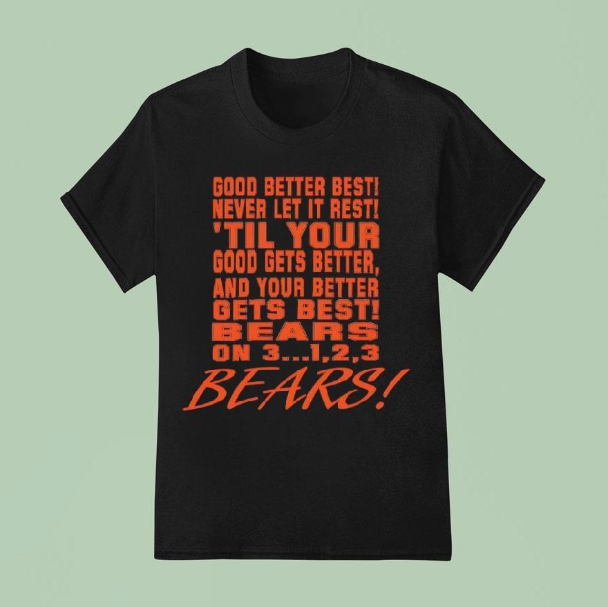 Versatile fashion, always with Chicago Bears Chant Good Better Best Never Let It Rest ’til Your Good Gets Better Shirt, attention all Chicago Bears fans! Get ready to show off your team spirit with the ultimate fan gear. Introducing the Chicago Bears Chant “Good Better Best Never Let It Rest ’til Your Good Gets Better” shirt. It’s time to elevate your game and support your favorite team with style.