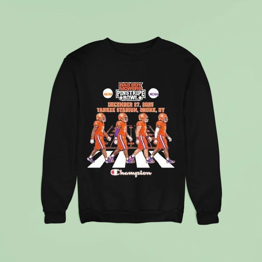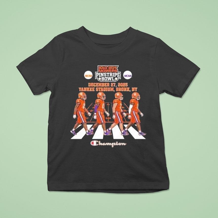 Chic comfort, all day with Clemson Tigers Bad Boy Mowers Pinstripe Bowl Champions Abbey Road Crosswalk Yankee Stadium Bronx New York December 27 2025 Champion Shirt, the Clemson Tigers have once again proven their dominance in football as they claimed the Bad Boy Mowers Pinstripe Bowl Championship on December 27, 2025 at Yankee Stadium in Bronx, New York. Fans celebrated the victory by recreating the iconic Abbey Road crosswalk scene, proudly wearing their Champion Shirts.