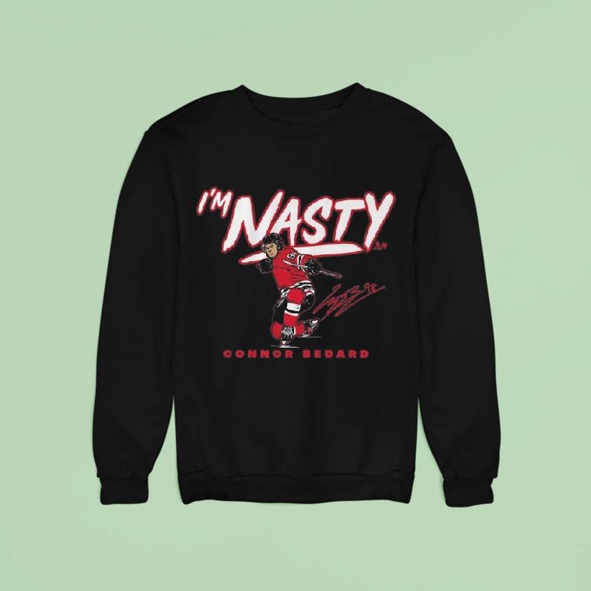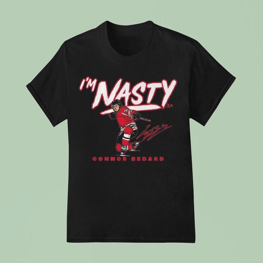 Your style, your signature with Connor Bedard I’m Nasty Signature Shirt, introducing the latest addition to my hockey wardrobe – the Connor Bedard “Nasty” Signature Shirt! This limited edition shirt pays homage to the young phenom’s electrifying play on the ice and is a must-have for any die-hard fan. Get ready to rock this shirt and show your support for the next NHL superstar.