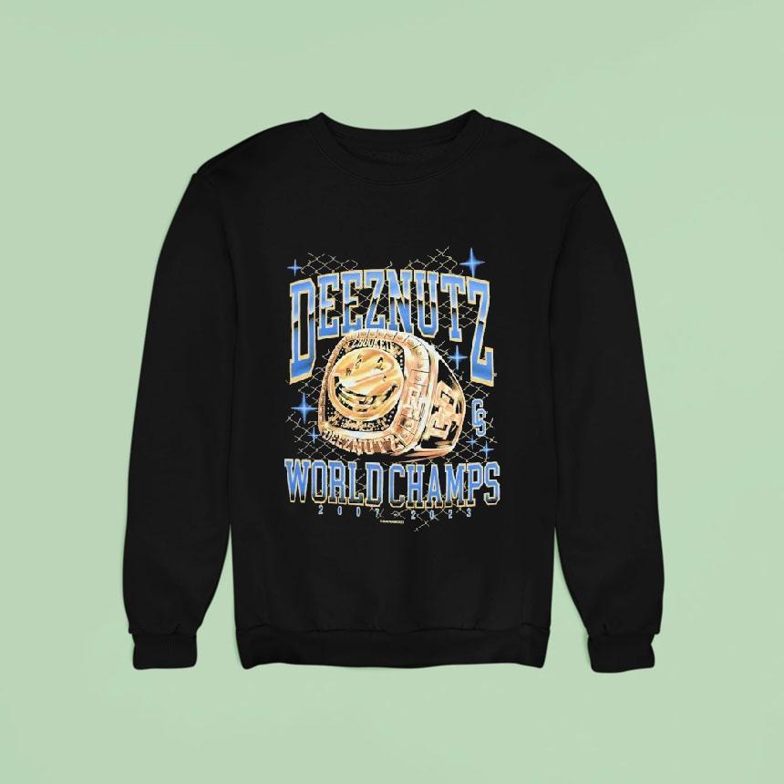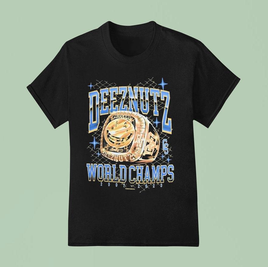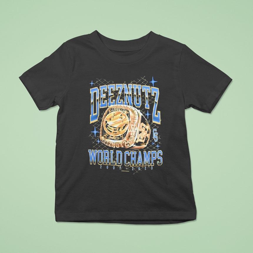 Wardrobe staple, endless style with Deez Nuts Worldchamps 2007 2023 Ring Shirt, introducing the must-have item for any true Deez Nuts fan – the limited edition Deez Nuts Worldchamps 2007 2023 Ring Shirt. Celebrate the team’s incredible victories with this iconic shirt, featuring the championship years and the bold Deez Nuts logo. Don’t miss out on owning a piece of history.