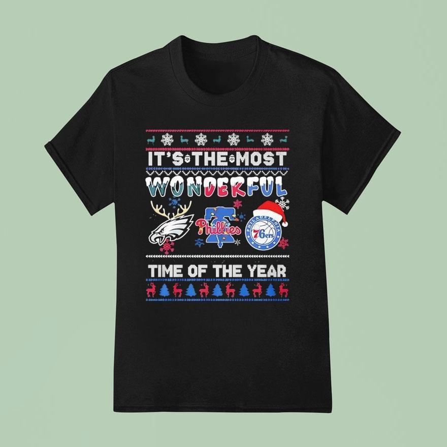 Your style, your way with Eagles S Phillies S 76ers It’s The Most Wonderful Time Of The Year Christmas Shirt, get ready to show your team spirit this holiday season with the Eagles, Phillies, and 76ers! Whether you’re cheering on the gridiron, the diamond, or the court, this Christmas shirt is the perfect way to express your love for all three of these beloved Philadelphia sports teams.