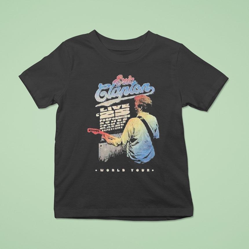 Elevate your casual wardrobe with Eric Clapton Live Performing Songs From His Classic Repertoire World Tour 2025 Shirt, get ready to rock out as legendary guitarist Eric Clapton takes the stage on his highly anticipated World Tour 2025. Fans will be treated to a special performance of his classic hits as they don their limited edition tour shirt, commemorating this iconic musician’s incredible legacy.