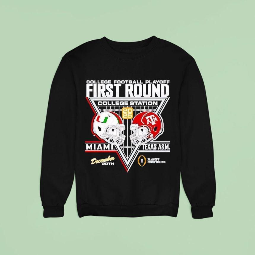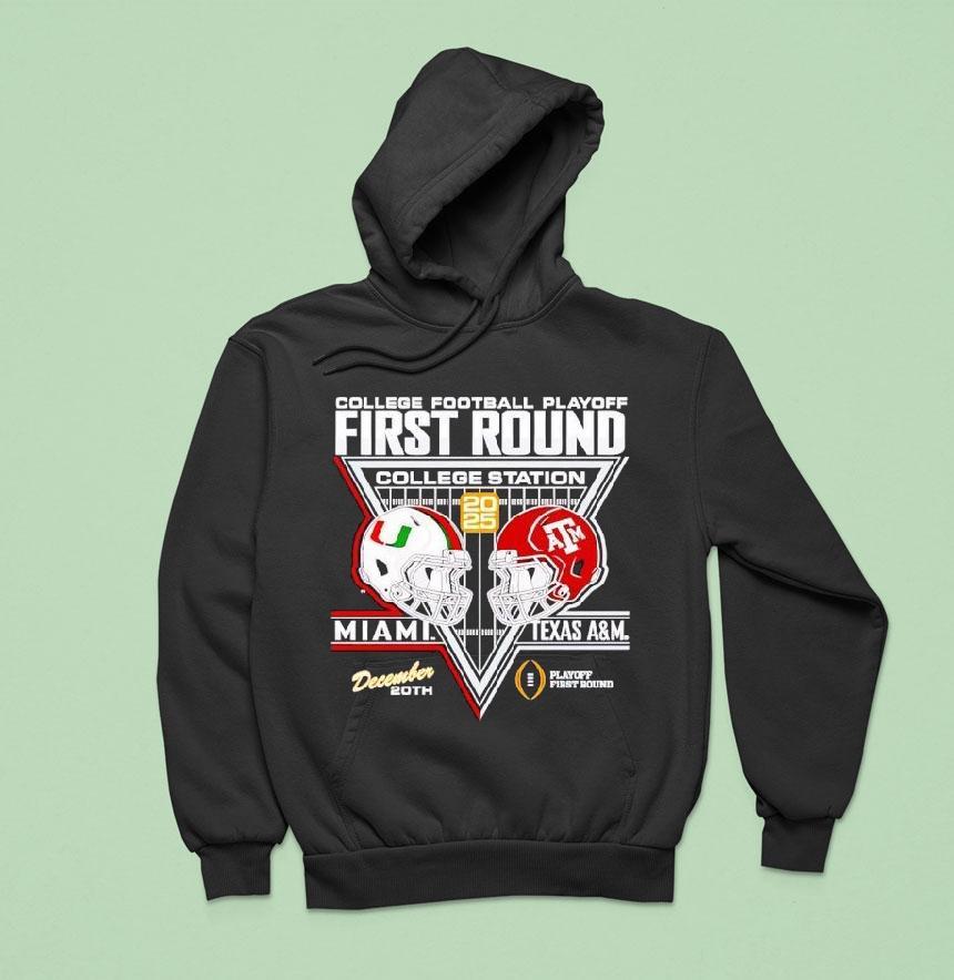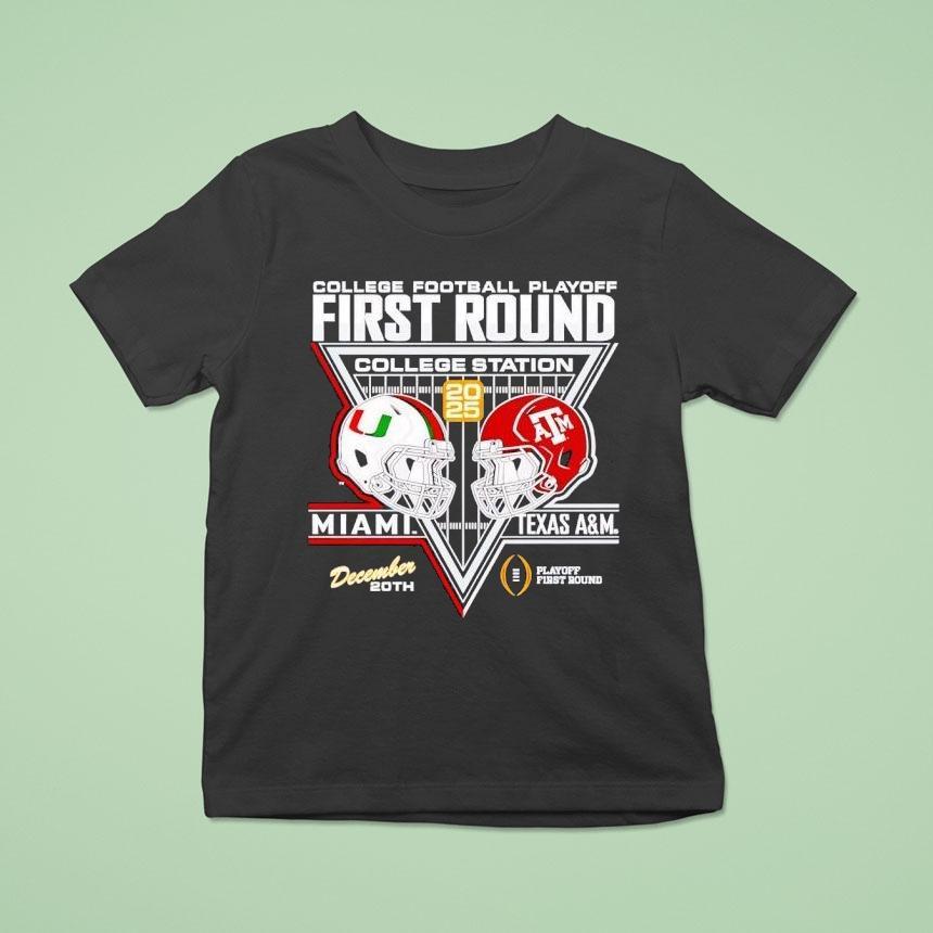 Dress it up or down with First Round Miami Hurricanes Vs Texas A And M Aggies 2025-2026 College Football Playoff Helmets Shirt, the highly anticipated first round matchup between the Miami Hurricanes and the Texas A and M Aggies in the 2025-2026 College Football Playoff is sure to be an intense battle. Fans are already showing their team pride with the newest addition to their wardrobe: the playoff helmets shirt.
