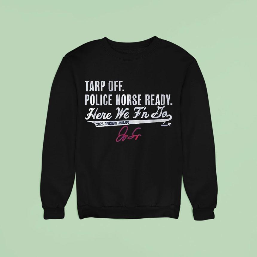 Easy-going style staple with George Springer Tarp Off, Police Horse Ready Here We F’n Go 2025 Division Champs Shirt, as the MLB season heats up, fans are eagerly awaiting the return of their beloved players. One name on everyone’s mind? George Springer. And with the Tarp Off, Police Horse Ready Here We F’n Go 2025 Division Champs shirt, fans are showing their support for the future champs.