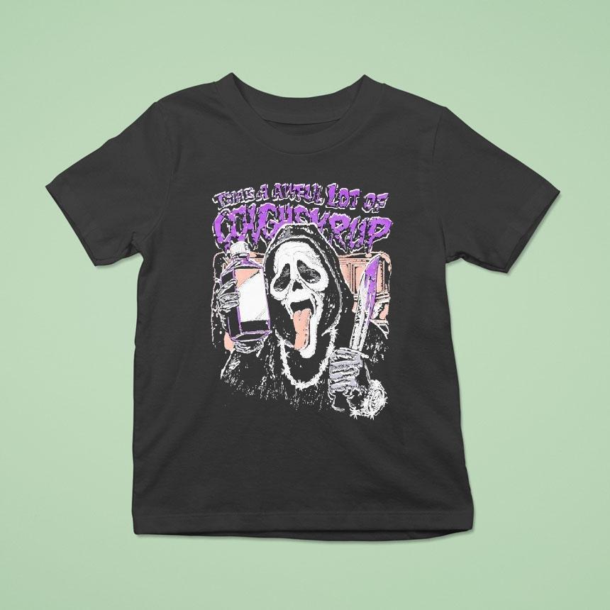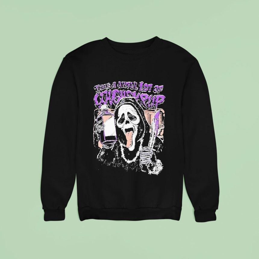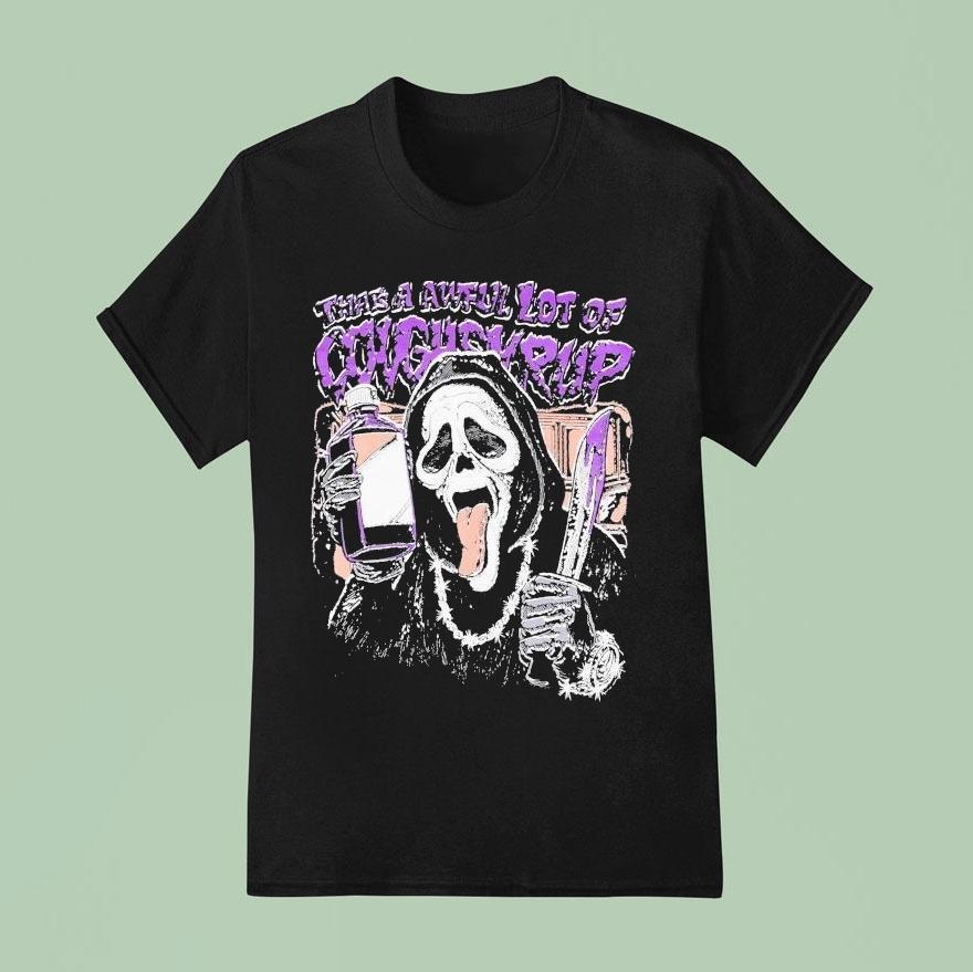 Casual cool, anytime chic with Ghostface Scream Awful Lot Of Cough Syrup Halloween Shirt, get ready to scream with fright this Halloween, because Ghostface from Scream is back and ready to haunt you in a whole new way. And this time, he’s got an awful lot of cough syrup in his system, making his iconic mask on this chilling shirt even more unsettling.