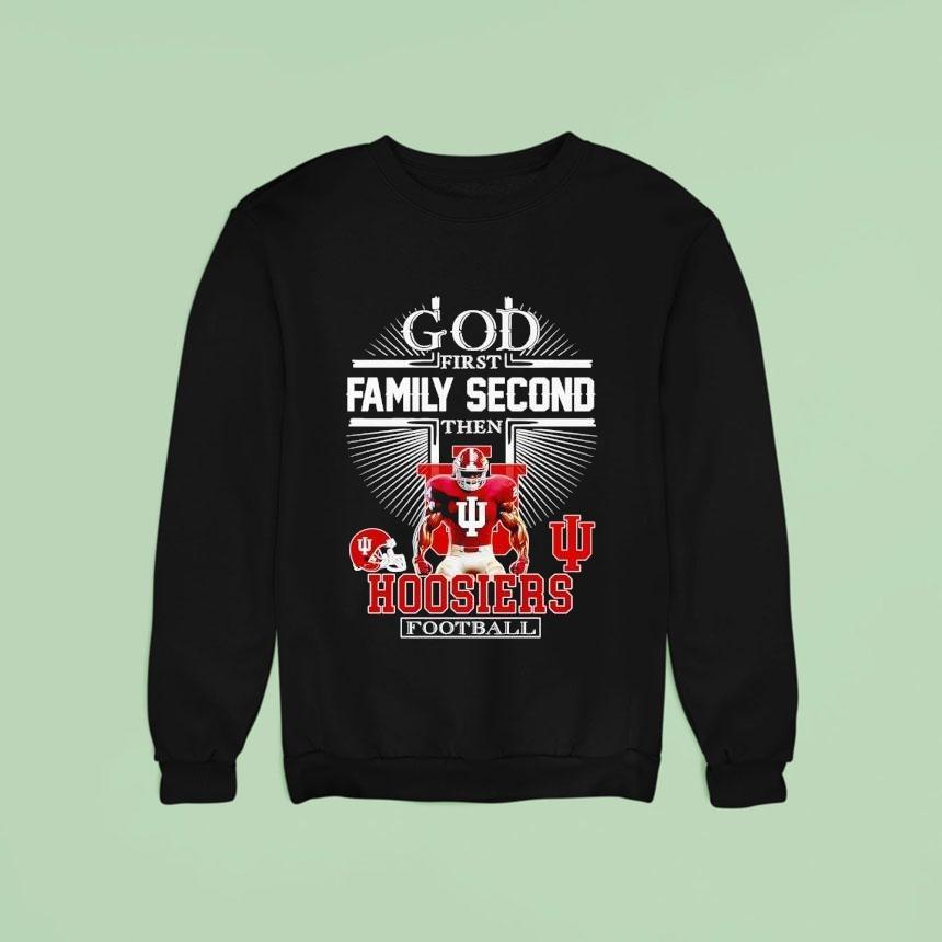 Everyday luxury, casual charm with God First Family Second Then Indiana Hoosiers Football Shirt, “Embrace your priorities with pride and passion as you sport the iconic Indiana Hoosiers Football shirt. With “God First, Family Second” emblazoned on your chest, show your love for both your faith and your team. Cheer on the Hoosiers with the support of your loved ones by your side.”
