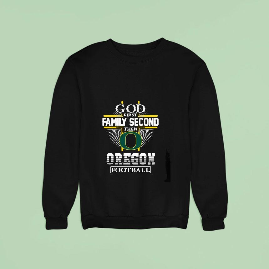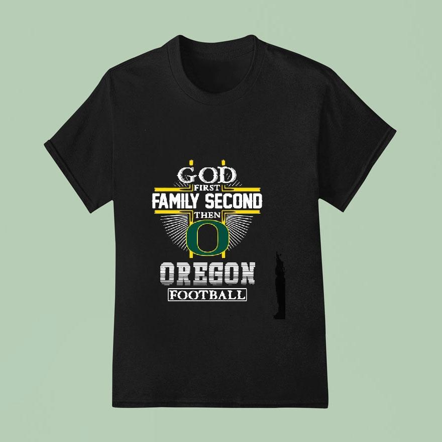 Fashion meets comfort with God First Family Second Then Oregon Ducks Football Shirt, “Rooting for the Oregon Ducks is more than just a game, it’s a way of life. For true fans, it’s “God first, family second, then Oregon Ducks Football” – a motto often proudly displayed on popular team apparel, like the iconic green and yellow shirt that symbolizes loyalty and passion on game day.”