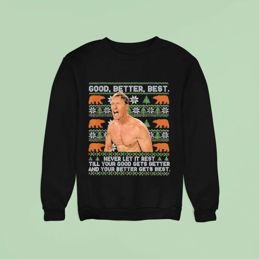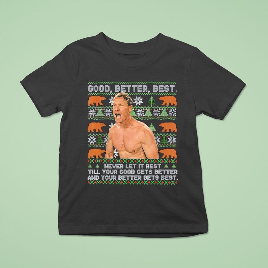 Your style, your signature with Good Better Best Never Let It Rest Xmas Ben Johnson Christmas Funny Shirt, “Get ready to sleigh the season with a little humor and a whole lot of style. The Good Better Best Never Let It Rest Xmas Ben Johnson Christmas Funny Shirt is the perfect way to spread some holiday cheer and look good doing it. Don’t miss out on this festive must-have!”