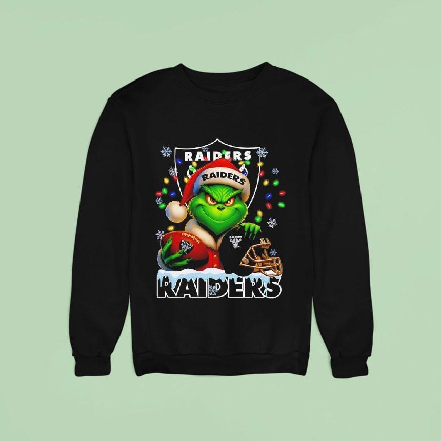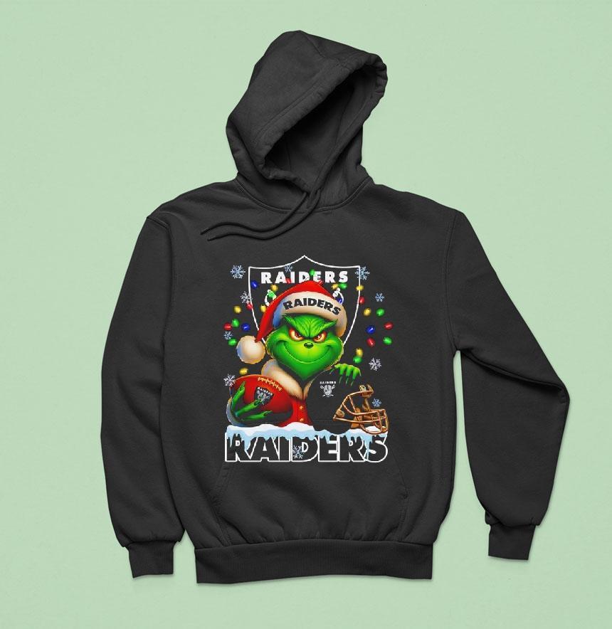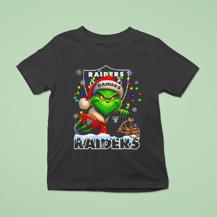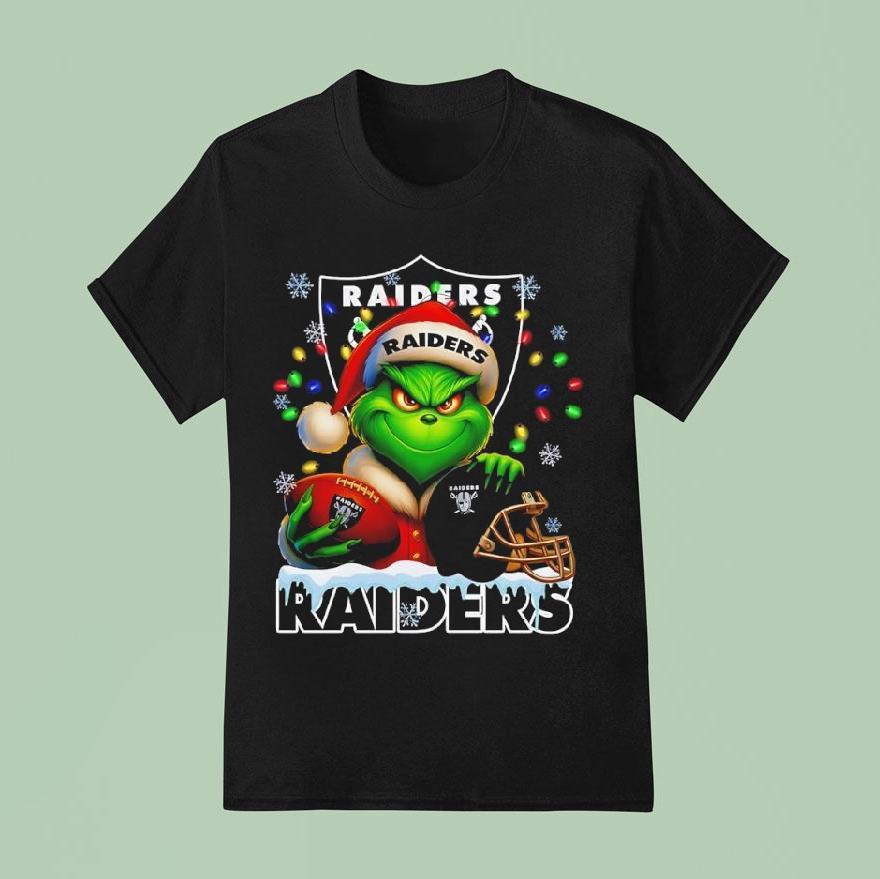Style that stands out with Grinch And Las Vegas Raiders Christmas Theme Helmet Shirt, ‘Tis the season for festive cheer and football frenzy! Get ready to support your Las Vegas Raiders in style with the Grinch-themed Christmas helmet shirt. Spread holiday spirit and team pride at the same time, because nothing says “Merry Christmas” like a Raiders Grinch mashup.