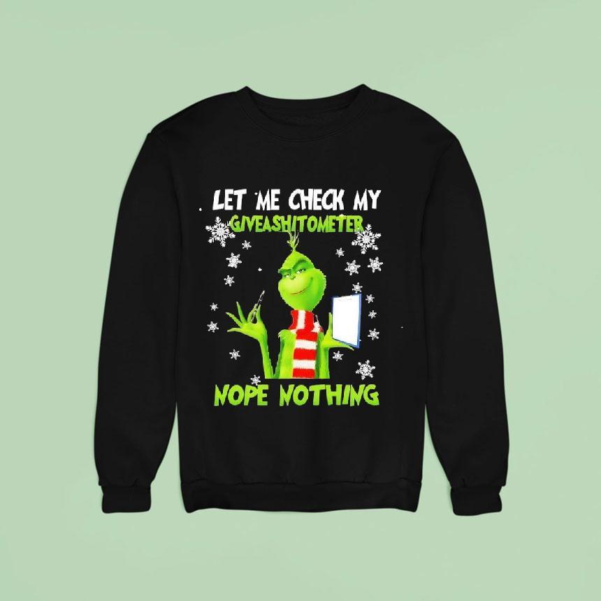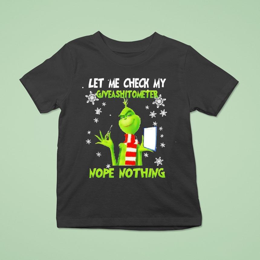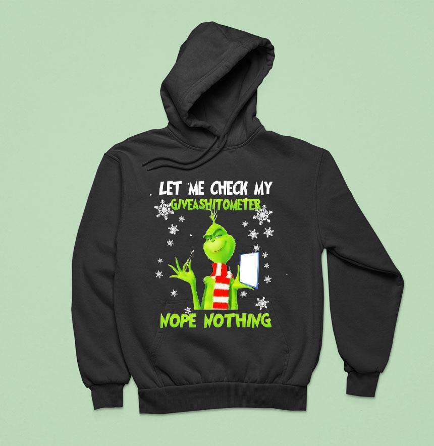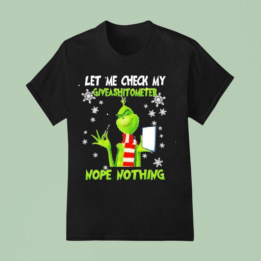 Versatile, stylish simplicity with Grinch Let Me Check My Giveashitometer Mope Nothing Shirt, are you feeling like the Grinch this holiday season? Let me check my giveashitometer. Nope, nothing on there about caring. So why not embrace your inner Grinch with this hilarious “Let Me Check My Giveashitometer Mope Nothing” shirt. It’s the perfect way to show your lack of holiday spirit.