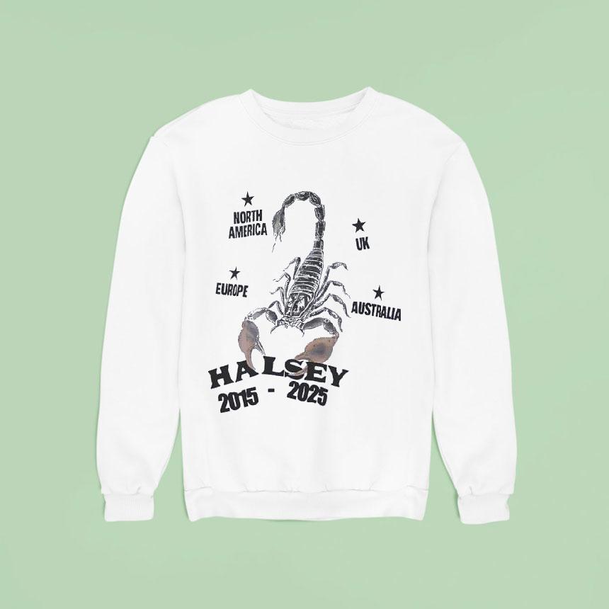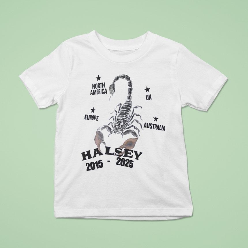 Comfort meets fashion with Halsey Scorpion North America Europe Uk Australia 2015 2025 Shirt, halsey’s iconic Scorpion logo has taken the world by storm, appearing on t-shirts in North America, Europe, UK, and Australia since 2015. As she prepares to hit the road again in 2025, fans everywhere are eagerly anticipating the release of the new and improved Halsey Scorpion shirt.