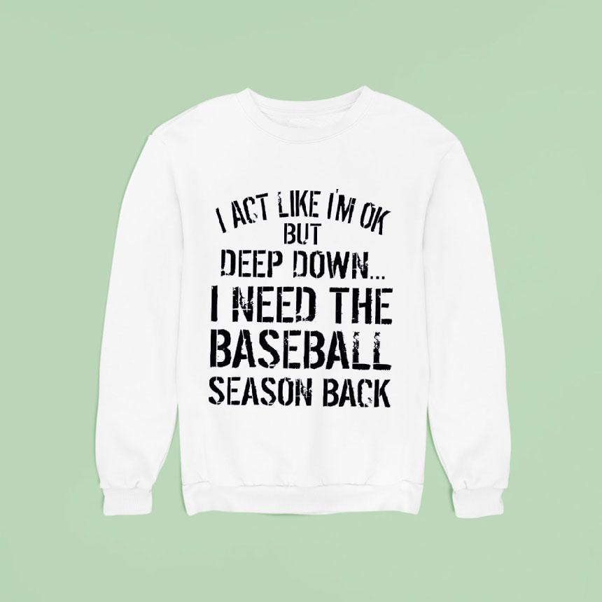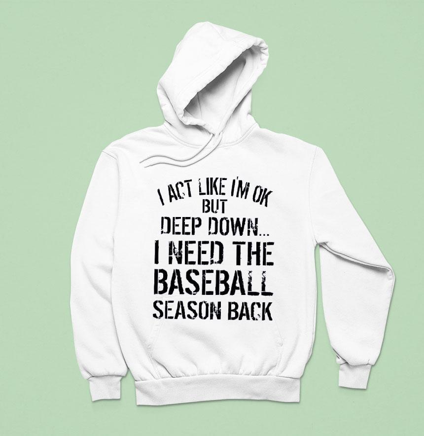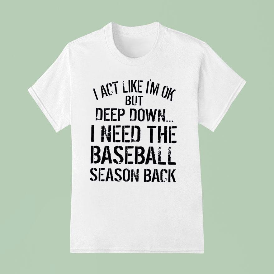 Effortless fashion statement with I Act Like I’m Ok But Deep Down I Need The Baseball Season Back Shirt, the baseball season is more than just a game, it’s a way of life. As fans, we may try to act like we’re okay without it, but deep down inside, we know we need it back. Show your love for the sport with the iconic “I Act Like I’m Ok But Deep Down I Need The Baseball Season Back” shirt.