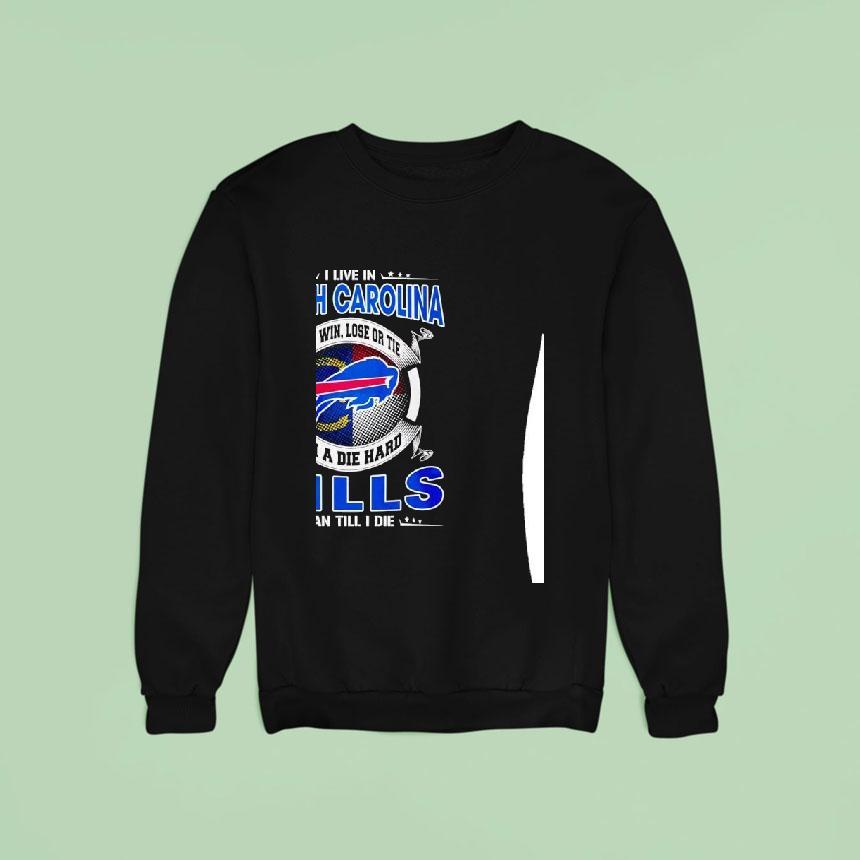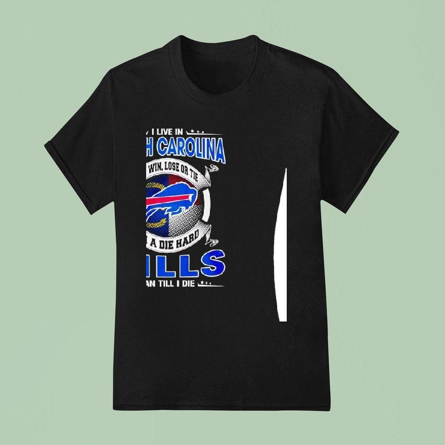 Casual comfort, chic look with I Live In North Carolina And Win Lose Or Tie I’m A Die Hard Bills Fan Till I Die Shirt, living in North Carolina, I may have been surrounded by Panthers fans, but my loyalty lies with the Buffalo Bills. Win, lose or tie, I proudly wear my die-hard Bills fan shirt, representing my unwavering support for my team until the very end.