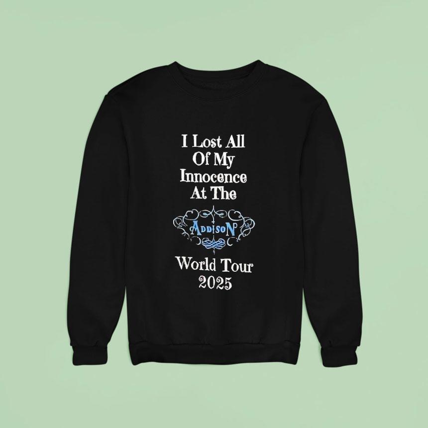 Simple yet versatile fashion with I Lost All Of My Innocence At The Addison World Tour 2025 Shirt, as I put on my Addison World Tour 2025 shirt each morning, memories of my carefree youth flood back. Little did I know, this shirt would be a symbol of the moment I lost all of my innocence and experienced the whirlwind of life on tour with my favorite artist.