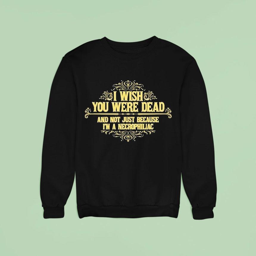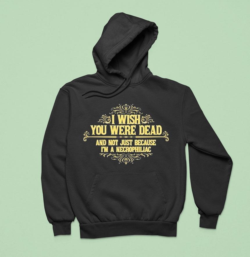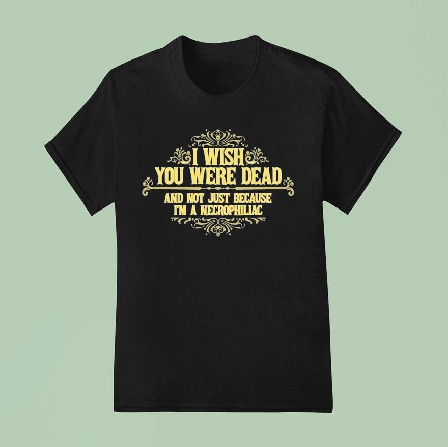 Style that speaks volumes with I Wish You Were Dead And Not Just Because I’m A Necrophiliac Shirt, looking for a daring and unconventional addition to your wardrobe? Look no further than our “I Wish You Were Dead” shirt. It’s not just for necrophiliacs, but for anyone who loves to push boundaries and make a bold statement. Get ready to turn heads and provoke conversation.