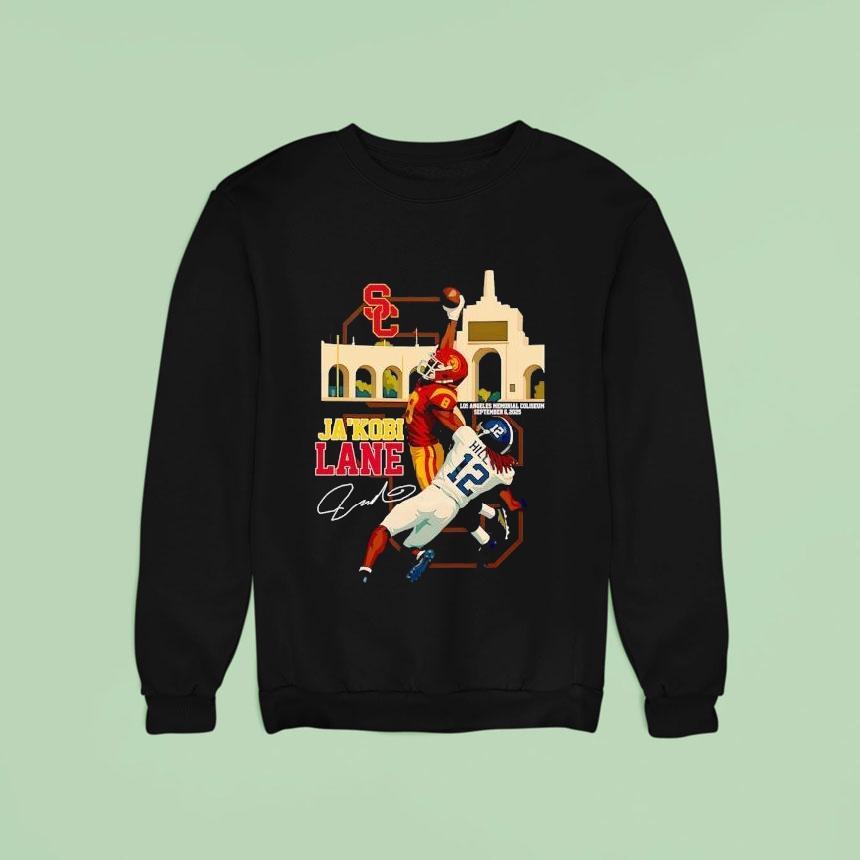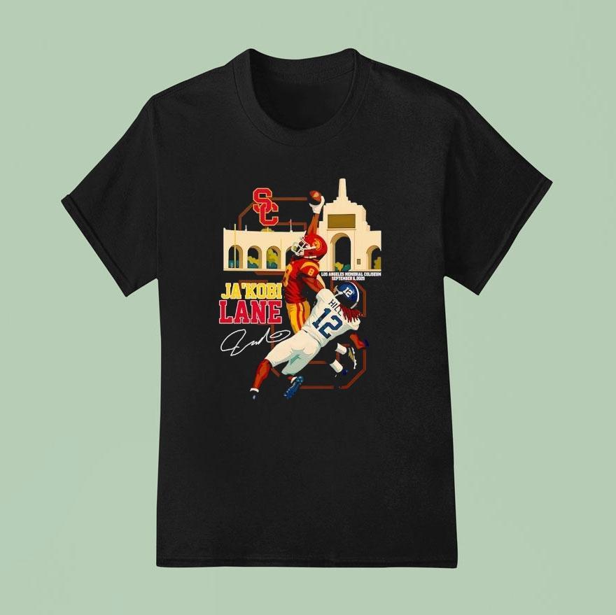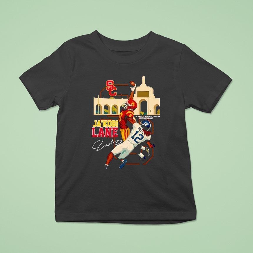 Effortless style, pure simplicity with Ja’kobi Lane Usc Trojans Los Angeles Memorial Coliseum 2025 Signature Shirt, in 2025, Ja’kobi Lane will be leading the USC Trojans onto the field at the iconic Los Angeles Memorial Coliseum wearing his signature shirt. This talented player is set to make a mark in Trojan history, and his unique style will only add to the excitement surrounding the team.