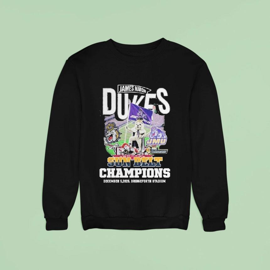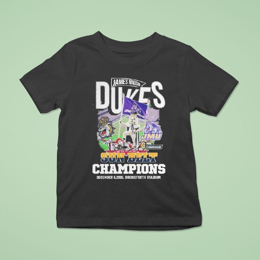 Timeless fashion, cozy fit with James Madison Dukes Stomp Troy Trojans Sun Belt Champions 2025 Bridgeforth Stadium Mascot Shirt, the James Madison Dukes are ready to defend their title as Sun Belt Champions in the upcoming 2025 season. With a strong win against the Troy Trojans, they will stomp their way to victory at Bridgeforth Stadium, proudly representing their mascot on the new official championship shirt.