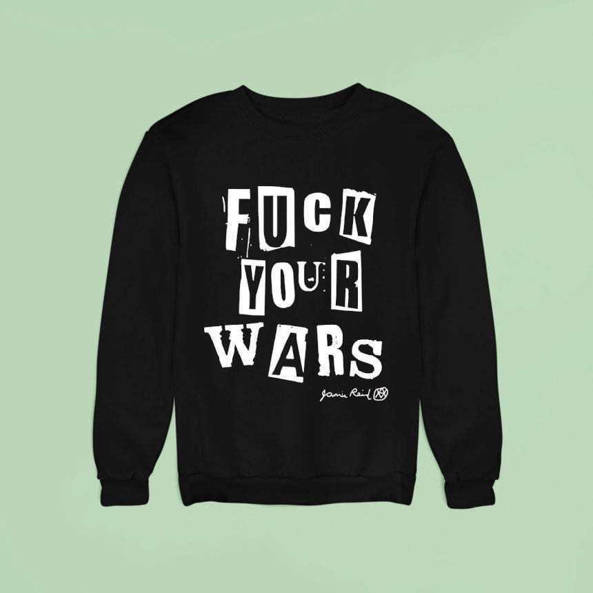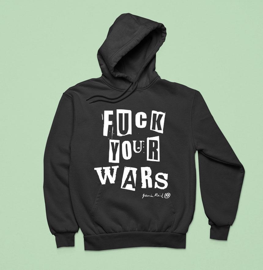 Your fashion canvas with Jamie Reid Fuck Your Wars Text Shirt, jamie Reid’s artistic activism takes on a new form with the bold statement of his “Fuck Your Wars” text shirt. With his signature punk style and strong message, Reid challenges the status quo and speaks out against the destructive nature of modern warfare.