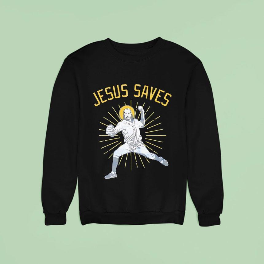 Wardrobe essential, always chic with Jesus Saves Baseball Player Graphic Shirt, celebrate your love for both Jesus and baseball with our latest graphic shirt. Featuring a talented baseball player with the words “Jesus Saves” emblazoned above, this shirt is perfect for any devout fan of the sport. Show off your faith on and off the field with this unique design.