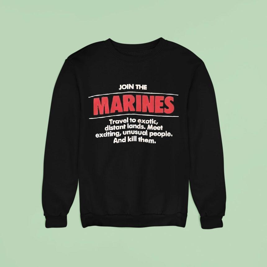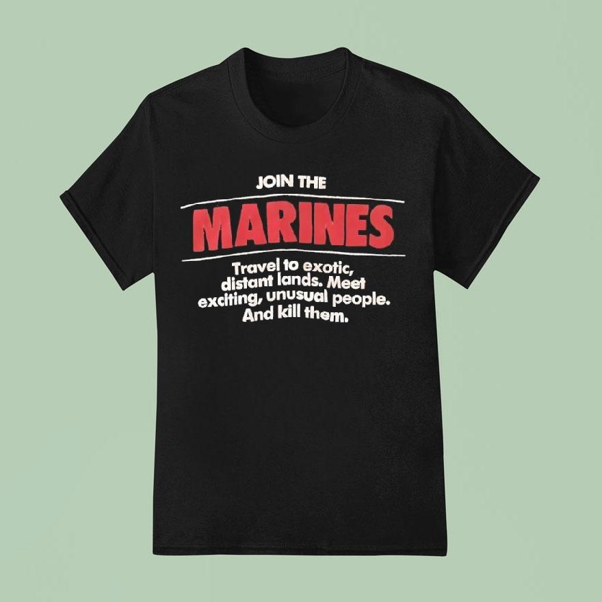 Versatile charm, timeless appeal with Join The Marines Travel To Exotic Distant Lands Meet Exciting Unusual People And Kill Them Shirt, are you ready for an adventure of a lifetime? Join the Marines and travel to exotic and distant lands where you will meet exciting and unusual people, and fulfill your duty to protect and defend your country. Get your “Kill Them” shirt and embrace the Marine spirit.