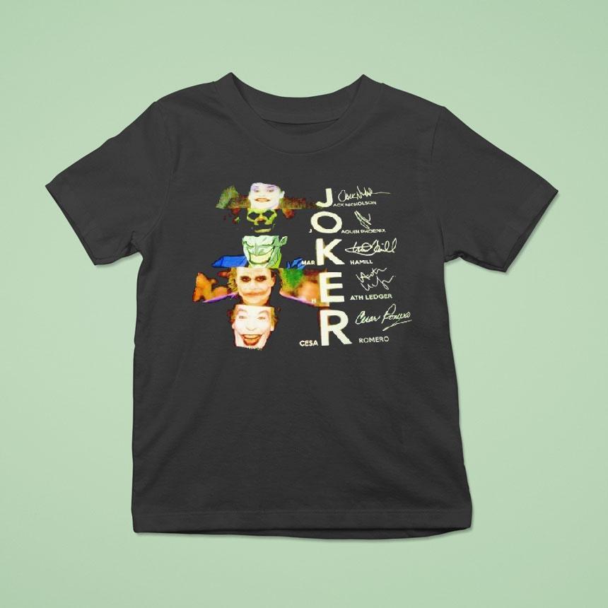 Unmatched comfort, chic look with Joker Jack Nicholson Joaquin Phoenix Markhanmill Heath Ledger Cesar Romero Signatures Shirt, “A lifetime of iconic performances from Joker’s reign supreme, from Jack Nicholson and Heath Ledger to Joaquin Phoenix and Cesar Romero. Still, their legacies live on, commemorated in the Markhanmill Signatures shirt – a must-have for any fan of the infamous clown prince of crime.”