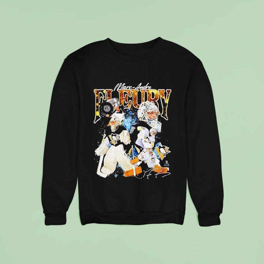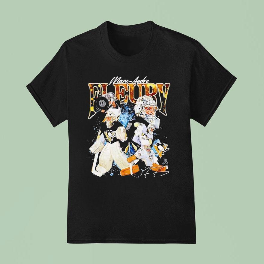 Wear it, love it, repeat with Marc-andre Fleury Pittsburgh Penguins Hockey Graphic Signature Shirt, get ready to show off your love for the Pittsburgh Penguins with the all-new Marc-Andre Fleury graphic signature shirt! Featuring the iconic goaltender’s signature and team logo, this shirt is a must-have for any die-hard fan. Show your support for your team and favorite player in style.