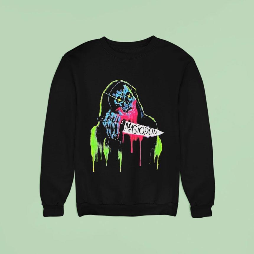 Classic charm, modern edge with Mastodon Neon Knife Skull Reaper Shirt, feast your eyes upon the ultimate combination of hardcore and kitsch with the Mastodon Neon Knife Skull Reaper shirt. This badass shirt is the perfect addition to any metalhead’s wardrobe, featuring a bold and edgy design that will surely make a statement wherever you go.