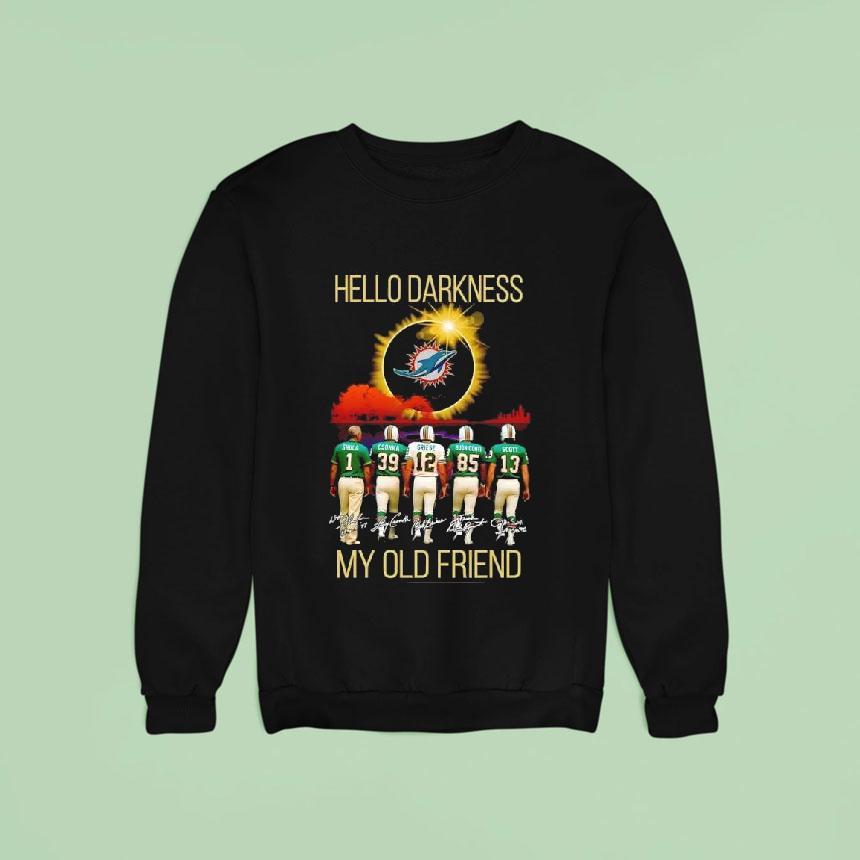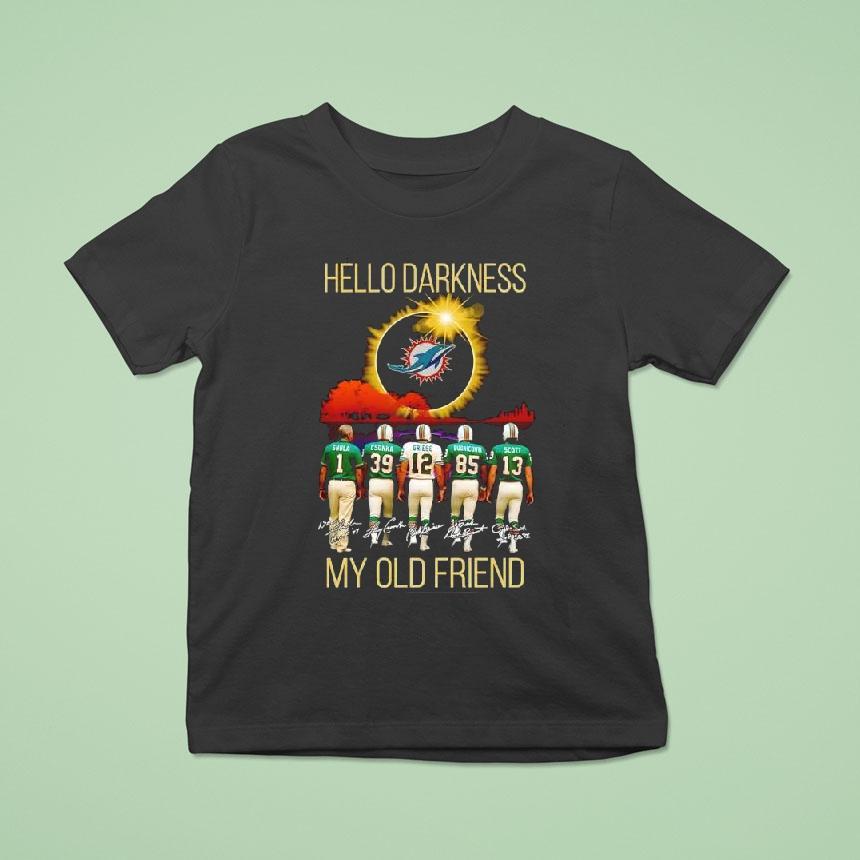 Chic minimalism, always with Miami Dolphins Hello Darkness My Old Friend Signatures Shirt, “Are you a die-hard fan of the Miami Dolphins? Then you know the feeling of being let down season after season. But fear not, for the darkness of defeat can now be worn proudly with the Miami Dolphins ‘Hello Darkness My Old Friend’ signature shirt. Let’s show our unwavering support!”