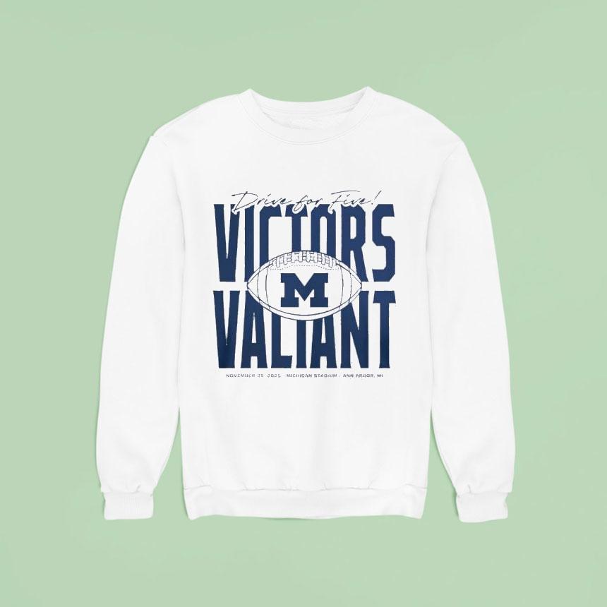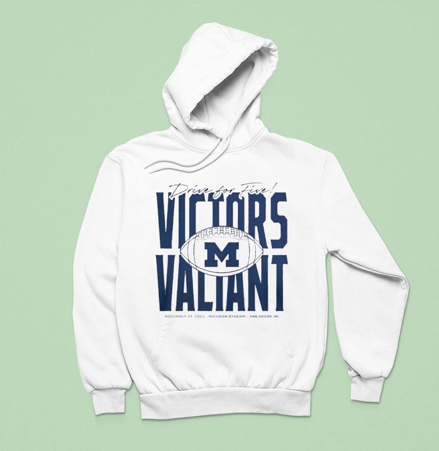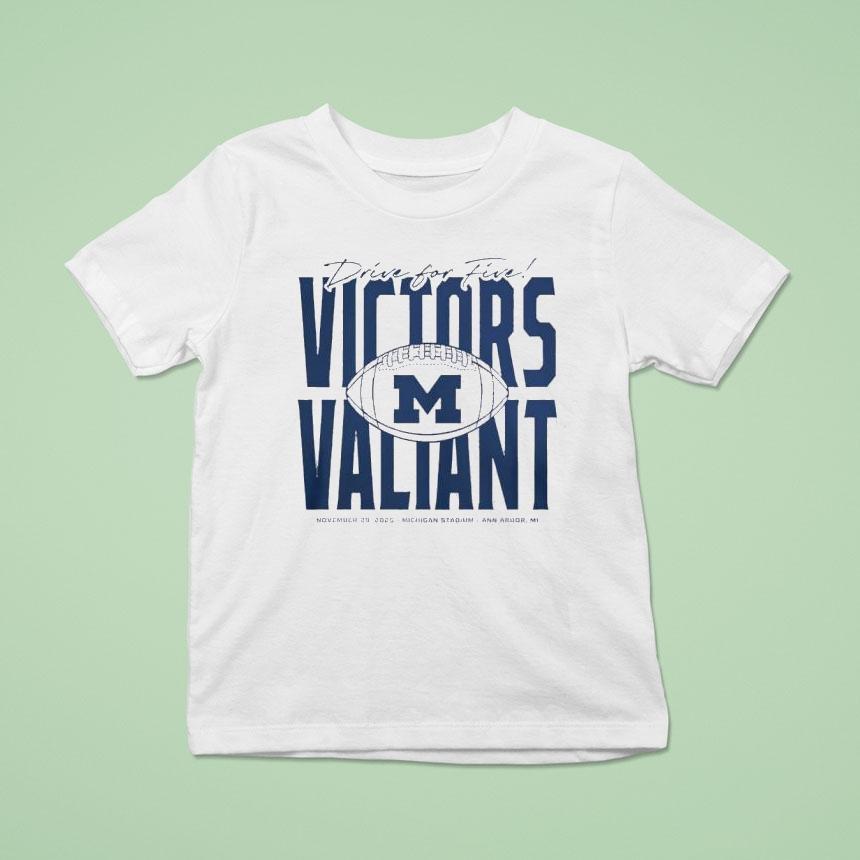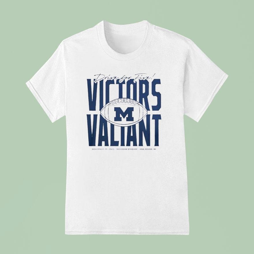 Classic tee, modern vibes with Michigan Football Drive For Five Victors Valiant Shirt, in the world of college football, the state of Michigan is known for its fierce competition and dedicated fans. But this season, the drive for victory is stronger than ever as Michigan Football aims for a historic fifth consecutive win, proudly represented by the Victors Valiant Shirt.