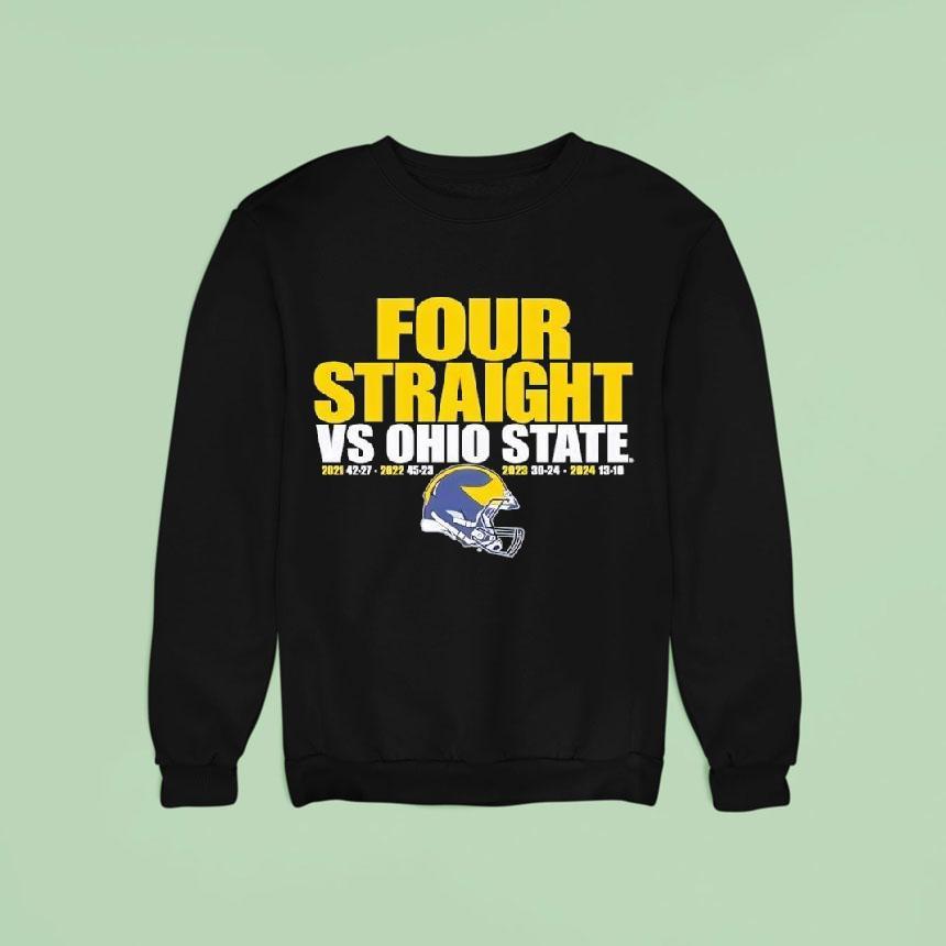 Wearable confidence booster with Michigan Wolverines Four Straight Vs Ohio State Shirt, celebrate the Michigan Wolverines’ remarkable four-year winning streak against the rival Ohio State with the ultimate fan gear – the Michigan Wolverines Four Straight Vs Ohio State shirt. Show your team pride and relive the thrilling victories with this must-have apparel for all die-hard fans.