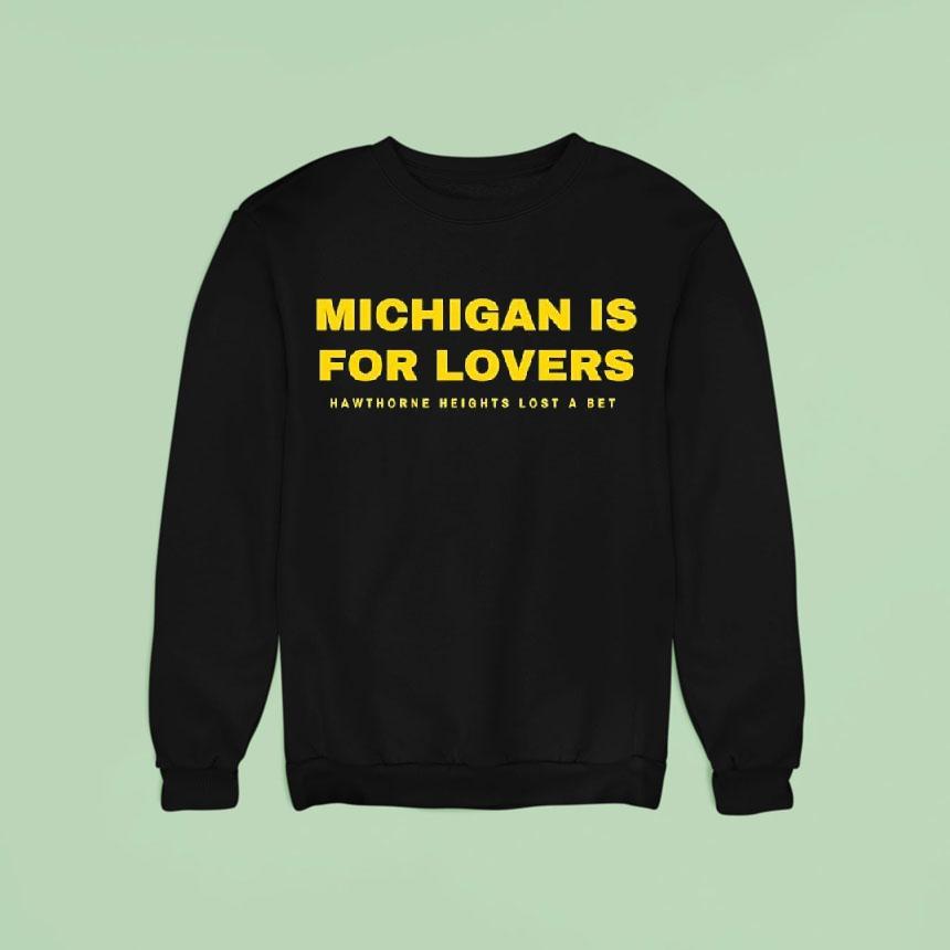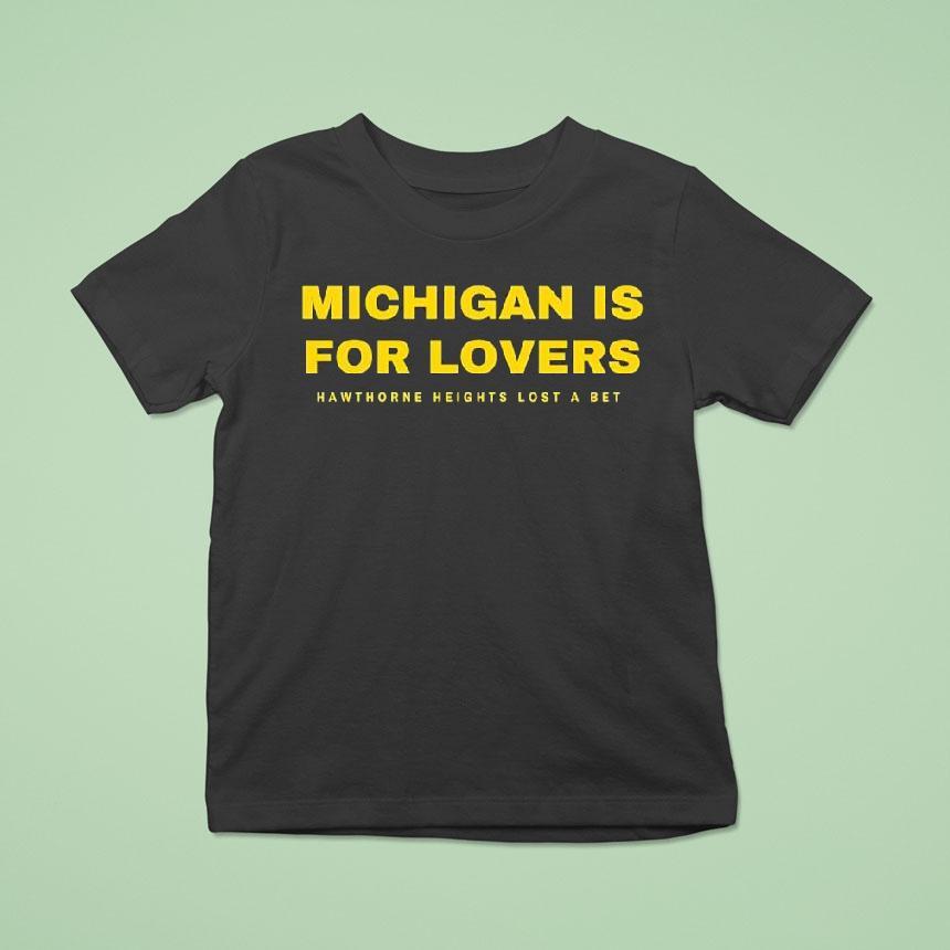 Instant style upgrade with Michigan Wolverines Is For Lovers Hawthorne Heights Lost A Bet Shirt, “Attention all Michigan Wolverines fans and hopeless romantics! Show off your love for both with our exclusive ‘Hawthorne Heights Lost A Bet’ shirt. Designed for die-hard fans who are not afraid to embrace their sensitive side, this shirt is a must-have for any Wolverines supporter.”