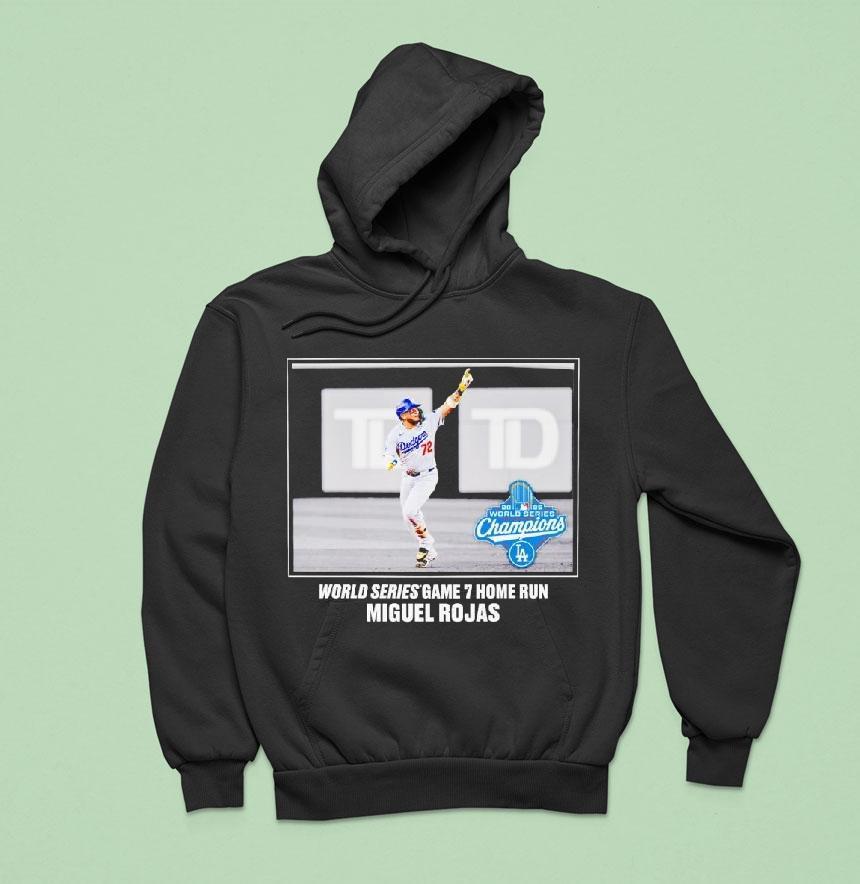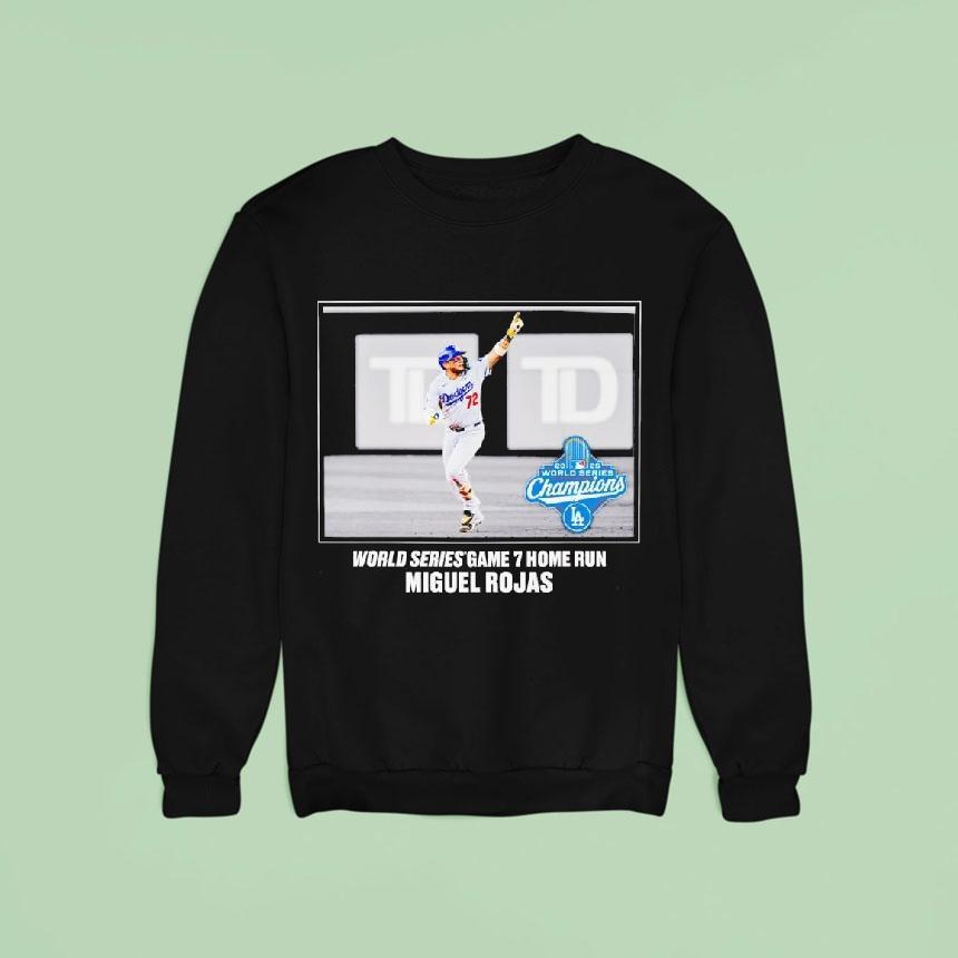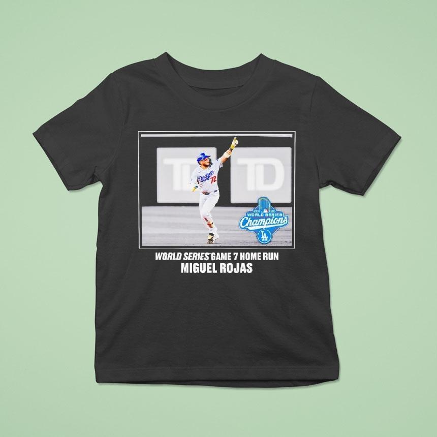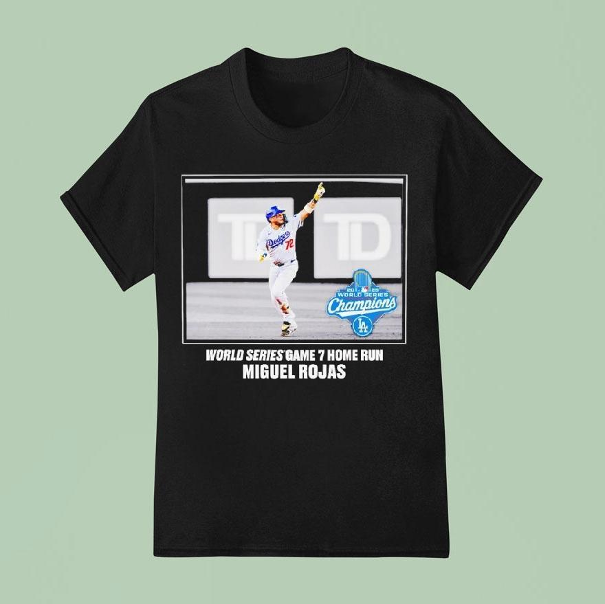Chic simplicity, maximum comfort with Miguel Rojas Los Angeles Dodgers 2025 World Series Champions Game 7 Home Run Moment Shirt, as the dust settles on the field and the Los Angeles Dodgers are being crowned as the 2025 World Series Champions, all eyes are on Miguel Rojas as he steps up to the plate in a pivotal Game 7. And with one swing of his bat, he becomes immortalized in Dodgers history with his unforgettable home run moment, now immortalized on the iconic Miguel Rojas Dodgers 2025 World Series Champions Game 7 Home Run Moment shirt.