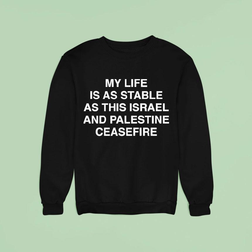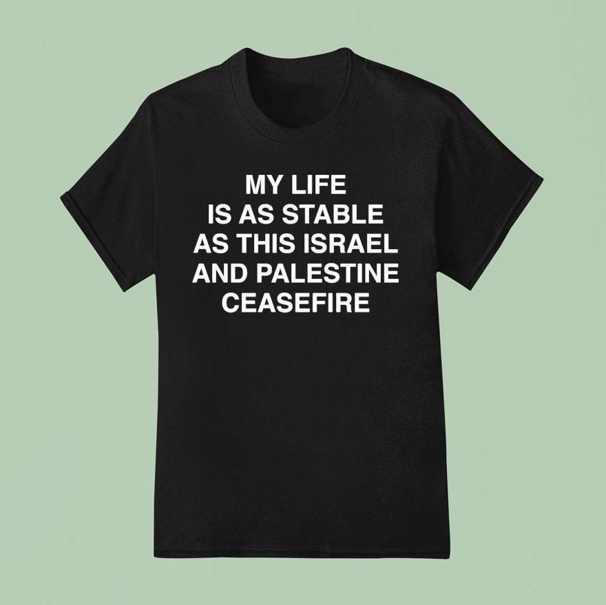 Everyday luxury, casual charm with My Life Is As Stable As This Israel And Palestine Ceasefire Shirt, as I slip on my Israel and Palestine ceasefire shirt, I am reminded of the fragile peace that exists between two warring nations. Just like the ceasefire, my life has reached a stable point, but I know the threads holding it together can easily unravel.