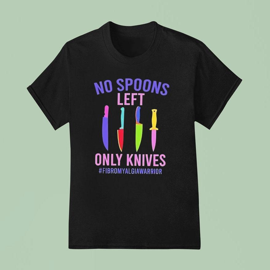 Relaxed elegance, anytime with No Spoons Left Only Knives Fibromyalgia Warrior Shirt, as a fibromyalgia warrior, everyday tasks can be a challenge. But with our “No Spoons Left Only Knives” shirt, you can proudly show off your strength and resilience. Let the world know that you are not defined by your illness.