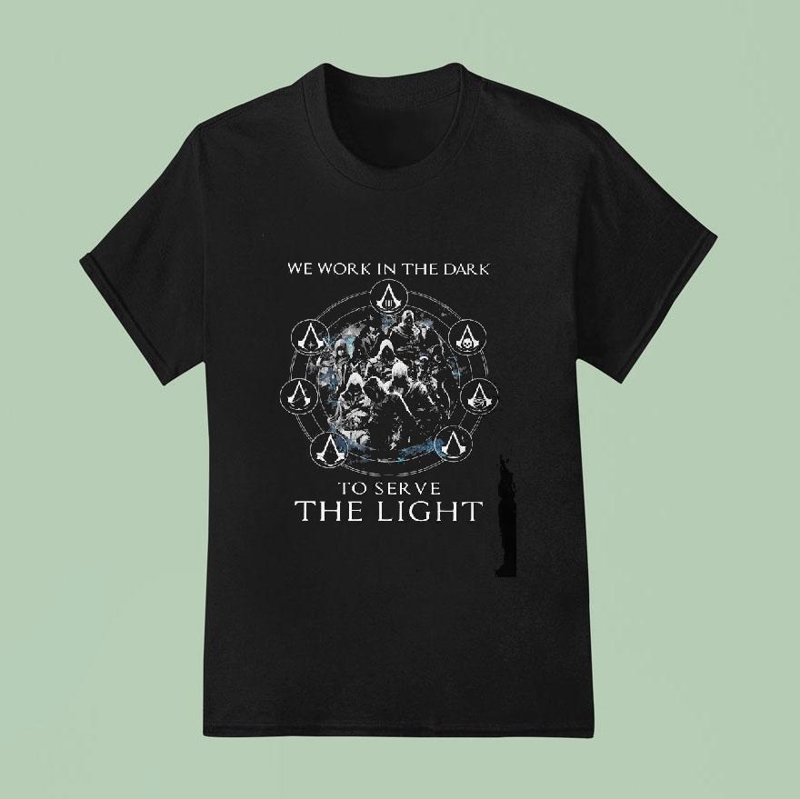 Staple piece, endless possibilities with Original Assassin’s Creed We Work In The Dark To Serve The Light Shirt, experience the thrill of being an assassin with the Original Assassin’s Creed “We Work In The Dark To Serve The Light” shirt. Channel your inner Ezio or Altair with this stylish and comfortable shirt, perfect for any gamer or fan of the iconic game series.