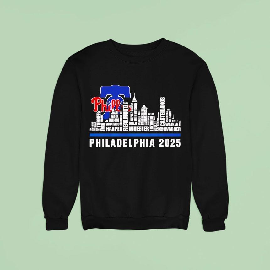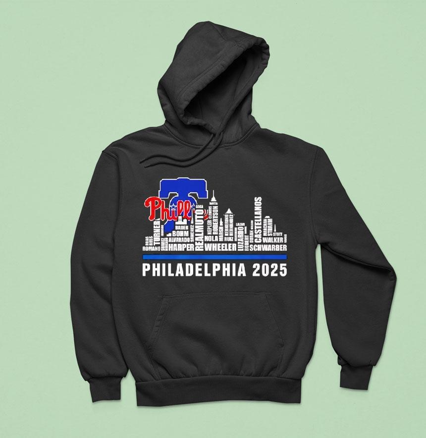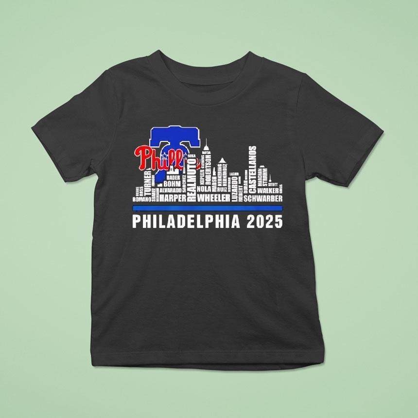 Casual flair, all occasions with Philadelphia City Skyline 2025 Philadelphia Phillies Baseball Players Shirt, in the year 2025, the Philadelphia City Skyline will be adorned with a new addition – the vibrant colors and iconic players of the Philadelphia Phillies Baseball team. The city will proudly wear their team’s shirt, showcasing their love for the sport and the city’s skyline in a perfect harmony.