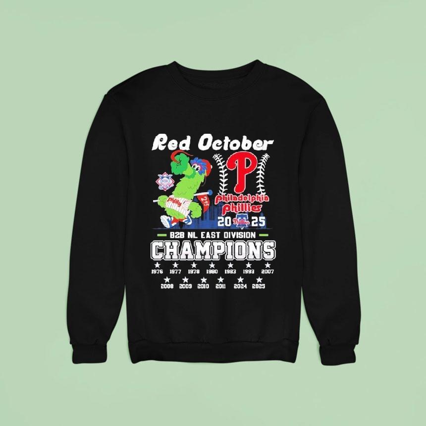 Your fashion statement, redefined with Philadelphia Phillies Red October B2b Nl East Division Champions 2025 Mascot Shirt, join in on the excitement of the Philadelphia Phillies’ historic back-to-back victories as NL East Division Champions in 2025! Show your team pride with the limited edition Red October B2b Mascot Shirt, featuring the beloved Phillies mascot and commemorating this unforgettable moment in franchise history. Get yours now!