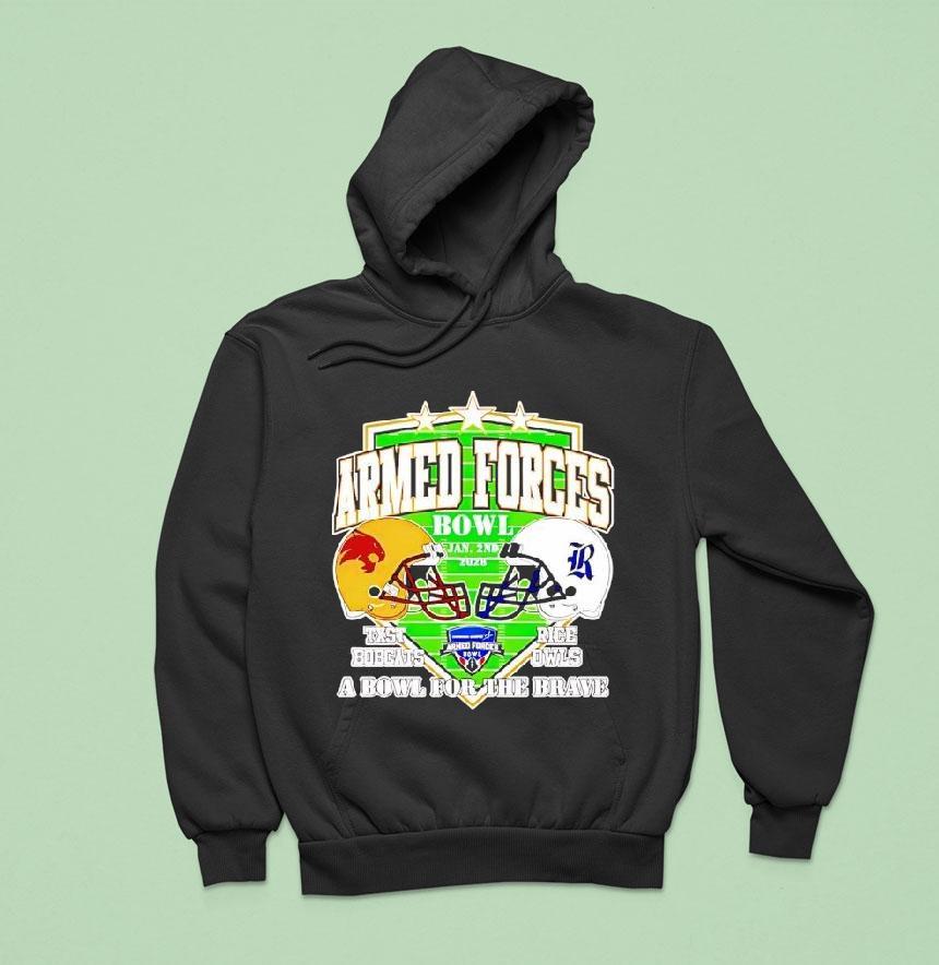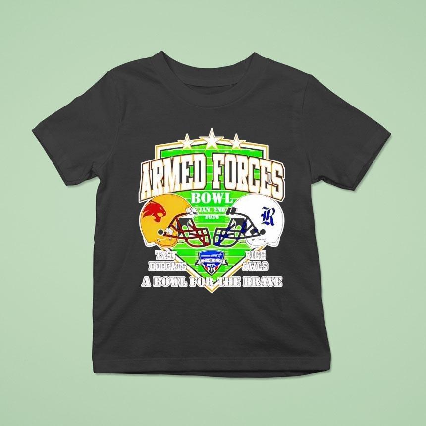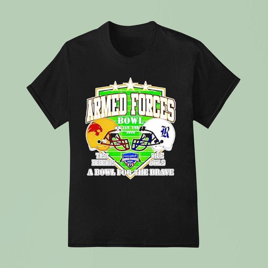 Casual chic, timeless appeal with Rice Owls Vs. Texas State Bobcats Armed Forces Texas State Bowl Shirt, in an exciting matchup of college football, the Rice Owls and Texas State Bobcats will face off in the Armed Forces Texas State Bowl. Fans can sport their team spirit with the commemorative shirt, as these two teams battle it out for the coveted bowl game title.