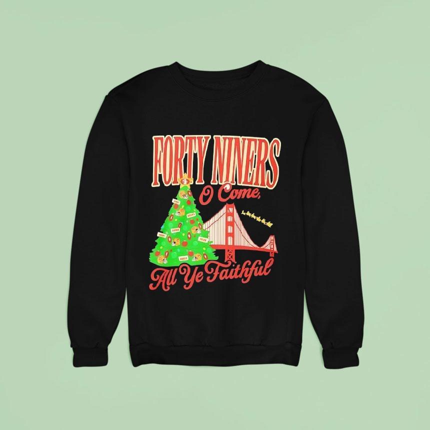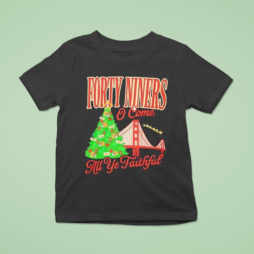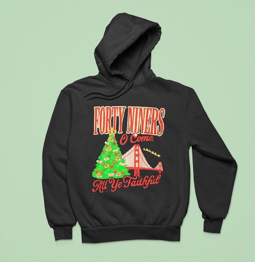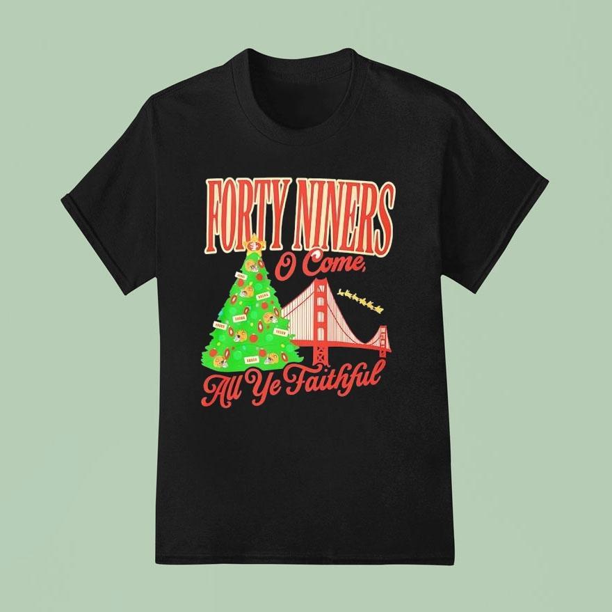 Versatile fashion at its best with San Francisco 49ers Forty Niners O Come All Ye Faithful Christmas Shirt, ‘Tis the season for holiday cheer and football fever, as the San Francisco 49ers, also known as the “Forty Niners,” release their festive O Come All Ye Faithful Christmas shirt. Show your love for both your team and the Christmas spirit with this must-have shirt for all faithful fans.