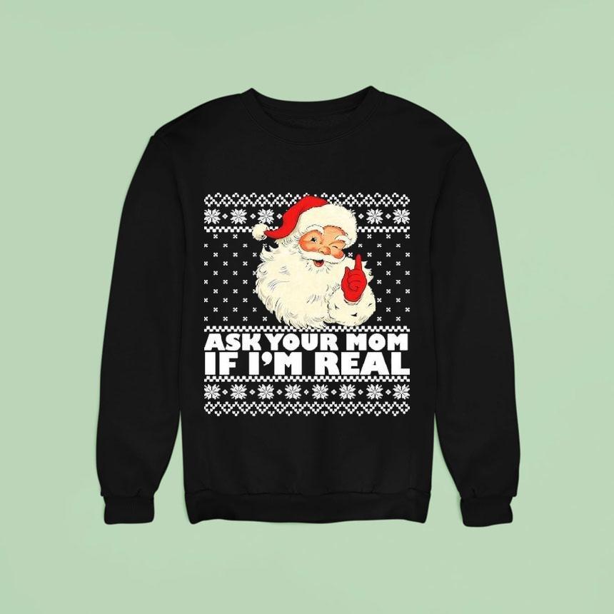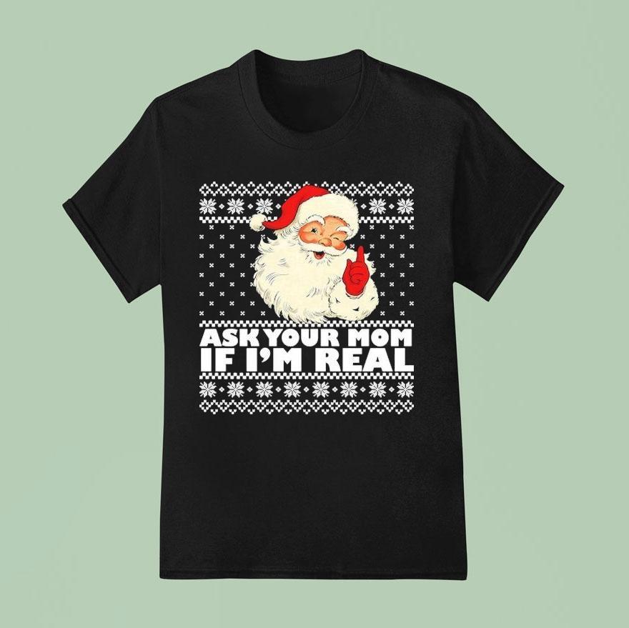 Wardrobe staple, endless style with Santa Ask Your Mom If Im Real Ugly Holiday Christmas Shirt, it’s that time of year again when Santa comes to town, spreading holiday cheer and gifts for all. But this Christmas, he’s got a special message for the kids – “Ask your mom if I’m real.” Show off your sense of humor with our “Ugly Holiday Christmas” shirt.