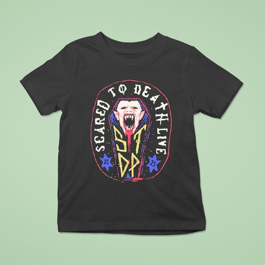 Versatile fashion, timeless appeal with Scared To Death Live 2025 Vampire Coffin Shirt, “Step into the future with the most spine-chilling shirt to ever exist. The Scared To Death Live 2025 Vampire Coffin Shirt combines fear with fashion, featuring a lifelike vampire emerging from a coffin. Brace yourself for a heart-stopping experience that will leave you breathless.”