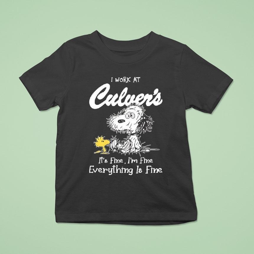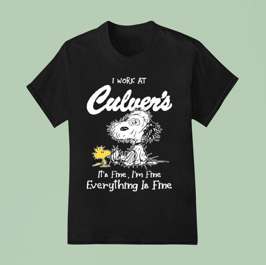 Simple sophistication, all day with Snoopy And Woodstock I Work At Culver’s It’s Fine I’m Fine Everything Is Fine Shirt, come and join the fun adventures of Snoopy and Woodstock as they work at Culver’s wearing their cool “It’s Fine I’m Fine Everything Is Fine” shirt. Get ready to laugh and enjoy delicious meals with these lovable characters.