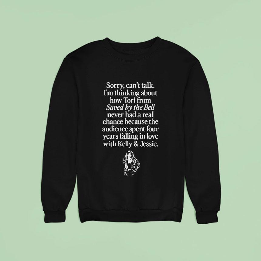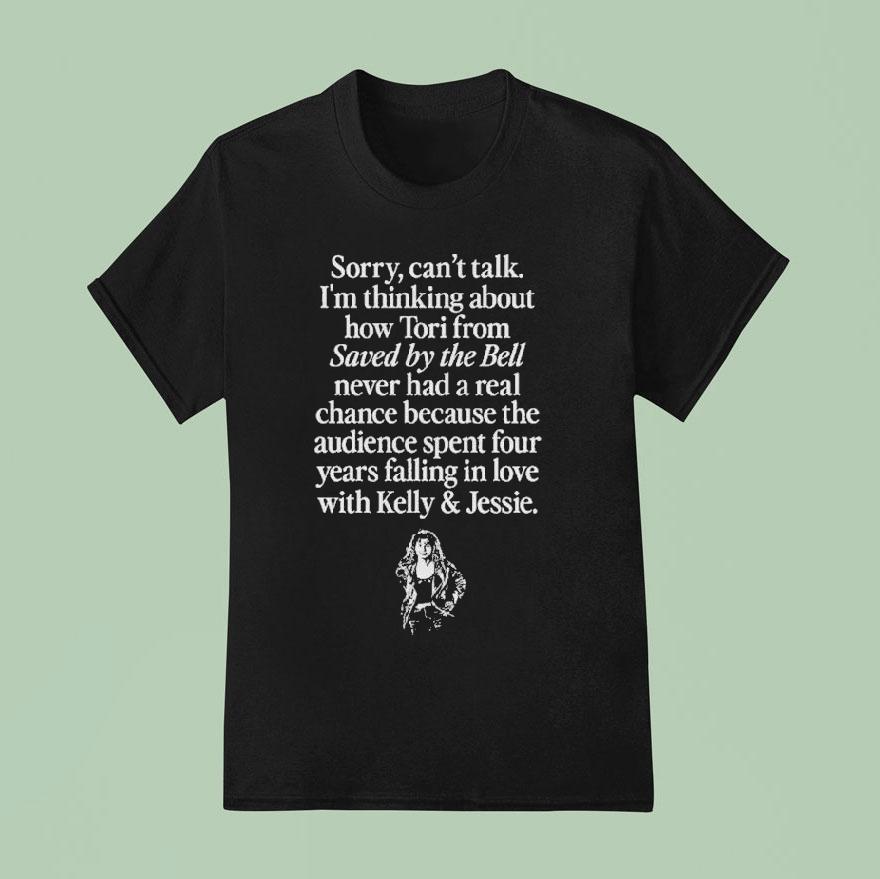 Comfort meets fashion with Sorry Can’t Talk I’m Thinking About Tori From Saved By The Bell Never Had A Real Chance Because The Audience Spent 4 Years Falling In Love With Kelly And Jessie Shirt, “Sorry can’t talk, Tori from Saved By The Bell has been on my mind. It’s a shame she never had a real chance, as the audience spent 4 years falling for Kelly and Jessie’s characters. But let’s not forget her iconic shirt that still captures our attention.”