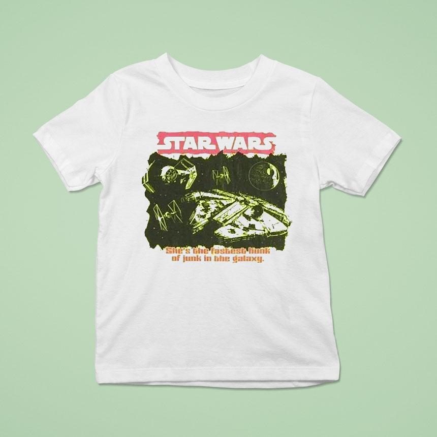 Uncomplicated elegance with Star Wars Fastest Hunk Of Junk In The Galaxy Shirt, “Unleash your inner space smuggler with the Star Wars Fastest Hunk Of Junk In The Galaxy Shirt. Featuring the iconic Millennium Falcon and a bold vintage design, this shirt is a must-have for any fan of the galaxy far, far away.”